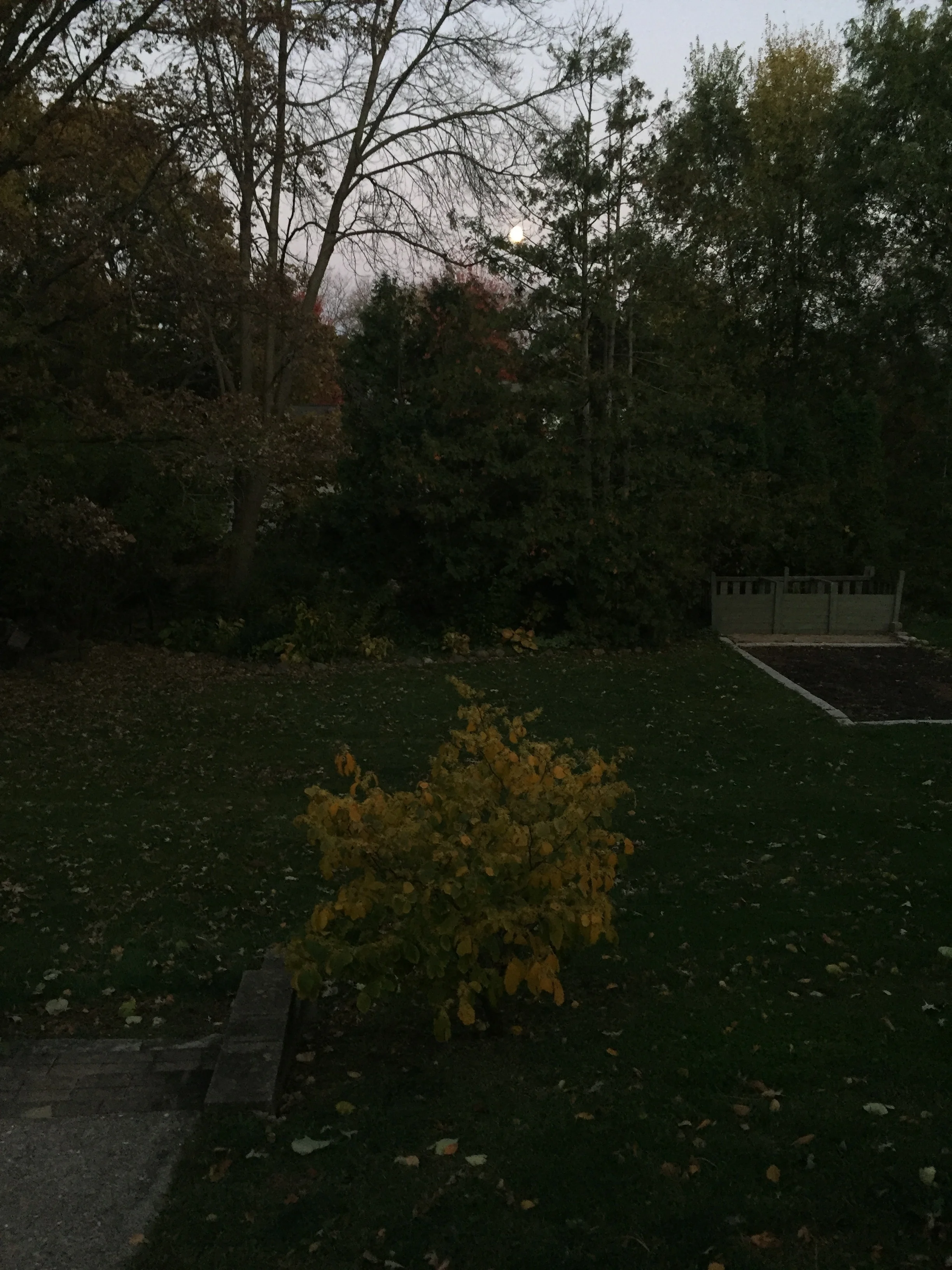 It being a beautiful Sunday, and me incapable of raking leaves, we decided to go for a Sunday drive...to Oconomowoc and then through northern Kettle Moraine country to Fox Point. Scenic and relaxing all the way, and brief but fun opportunities to check in with all five grandkids (and their parents). Back home, a waxing, almost full moon rising over the backyard.