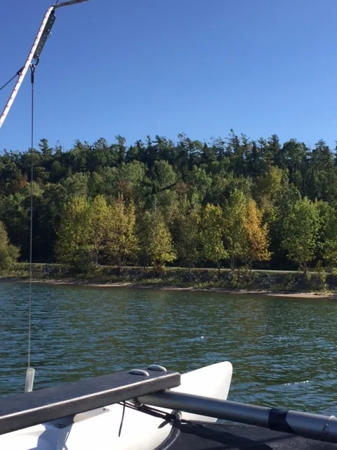 Beautiful day. To the dump, of course, but then a sail—only to find the steady east wind gone light and variable. But who cared? It was fun trying to outsmart the puffs. Back at the property a steady east wind, sending in ten inch waves to endlessly trip on our ridge of rocks. Sitting in the Zen spot, I found it hard not to be hypnotized, rendered immobile, and like Sylvester, turned into a piece of the shoreline lithosphere.