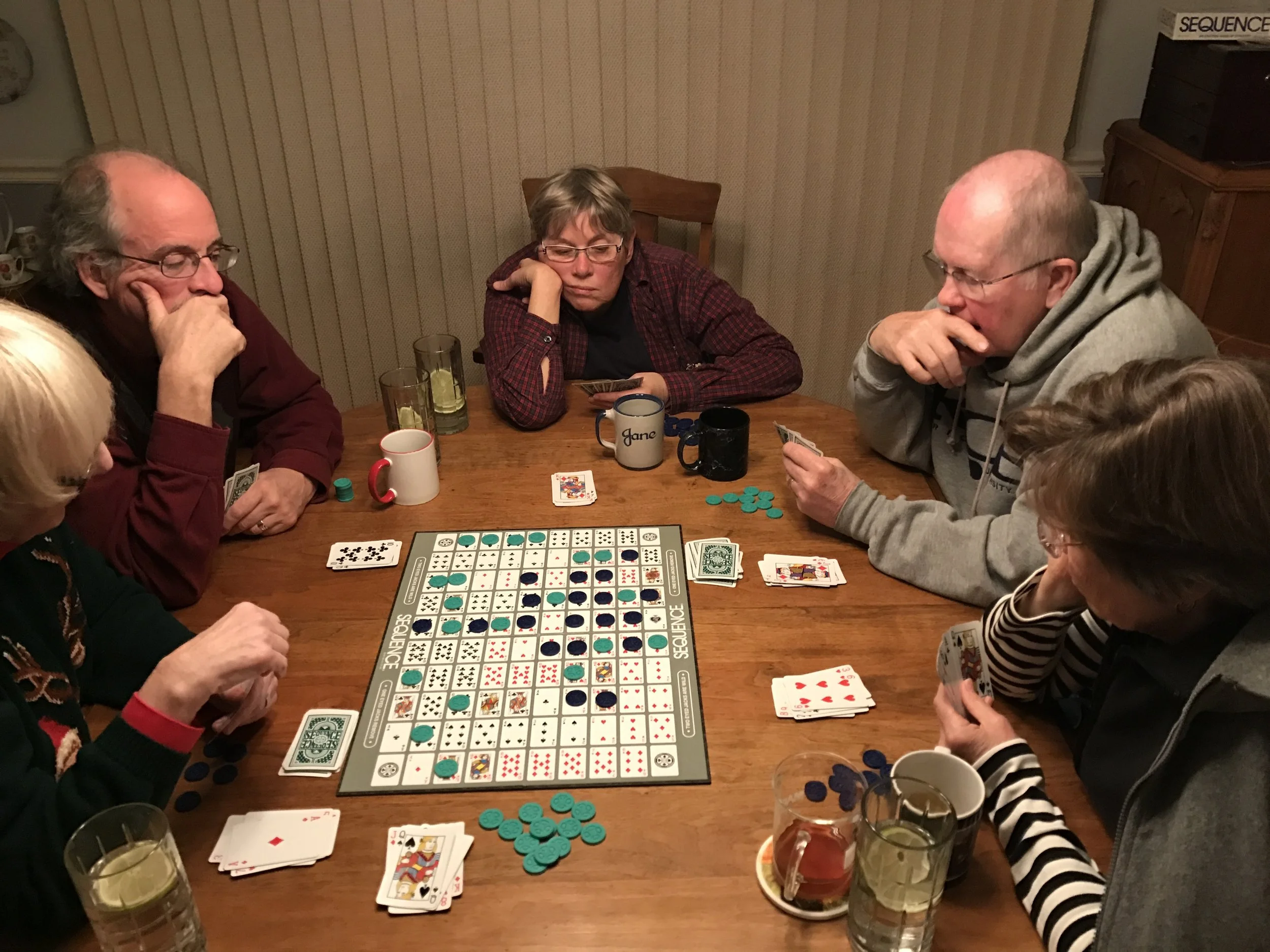 Dundee cakes, then prep for dinner at the neighbors, which was followed by Sequence. Green lost 3 to 1.