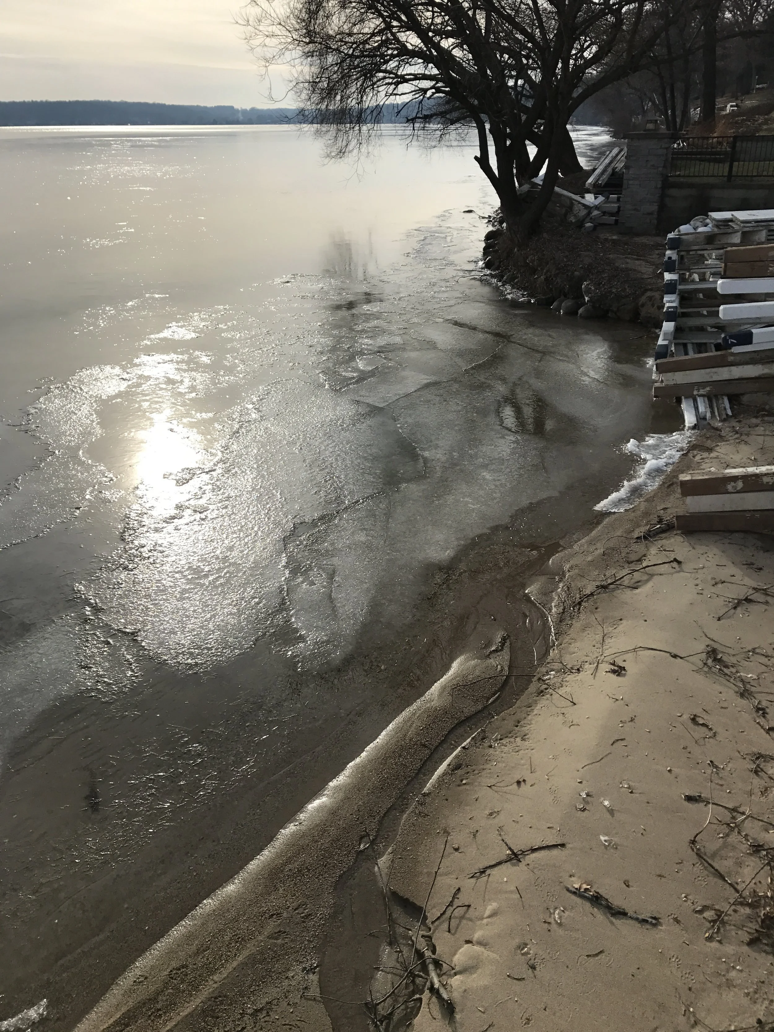 Ice along the Lake Geneva shore, but open farther out. And no wind. Bri did set up on Pewaukee and got in a surprisingly good ride. Maybe wind on Pewaukee tomorow.