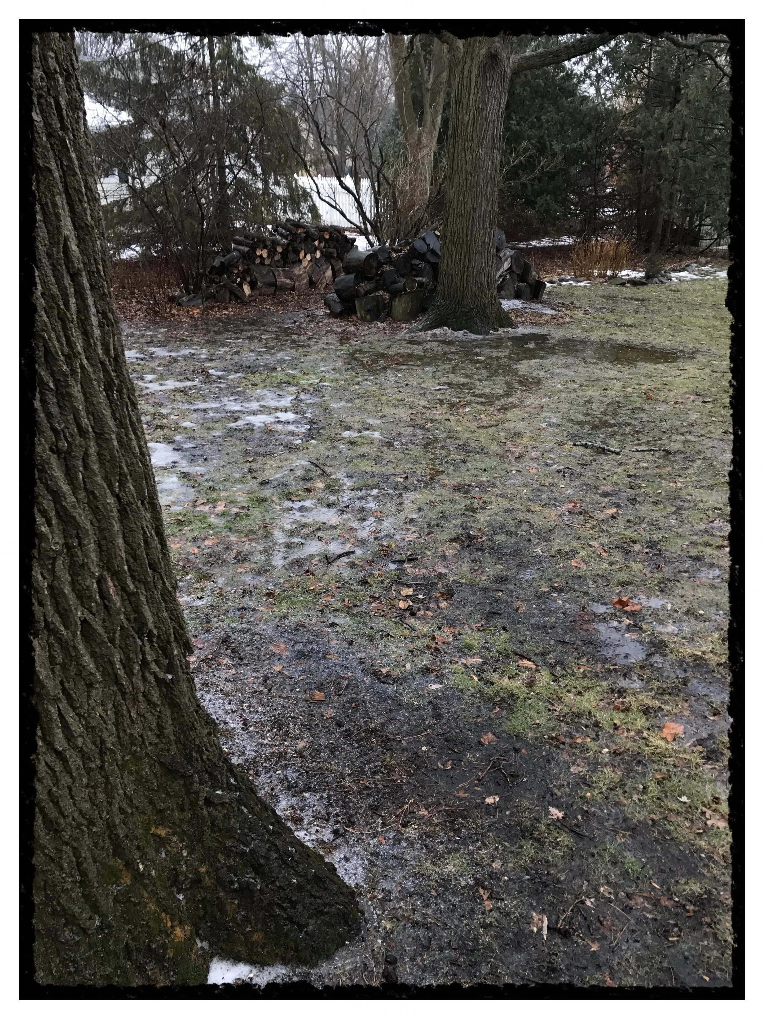 The driveway a slipway. Creepers needed to get around the block. Steady rain all day, freezing when making contact with the hard-frozen ground.