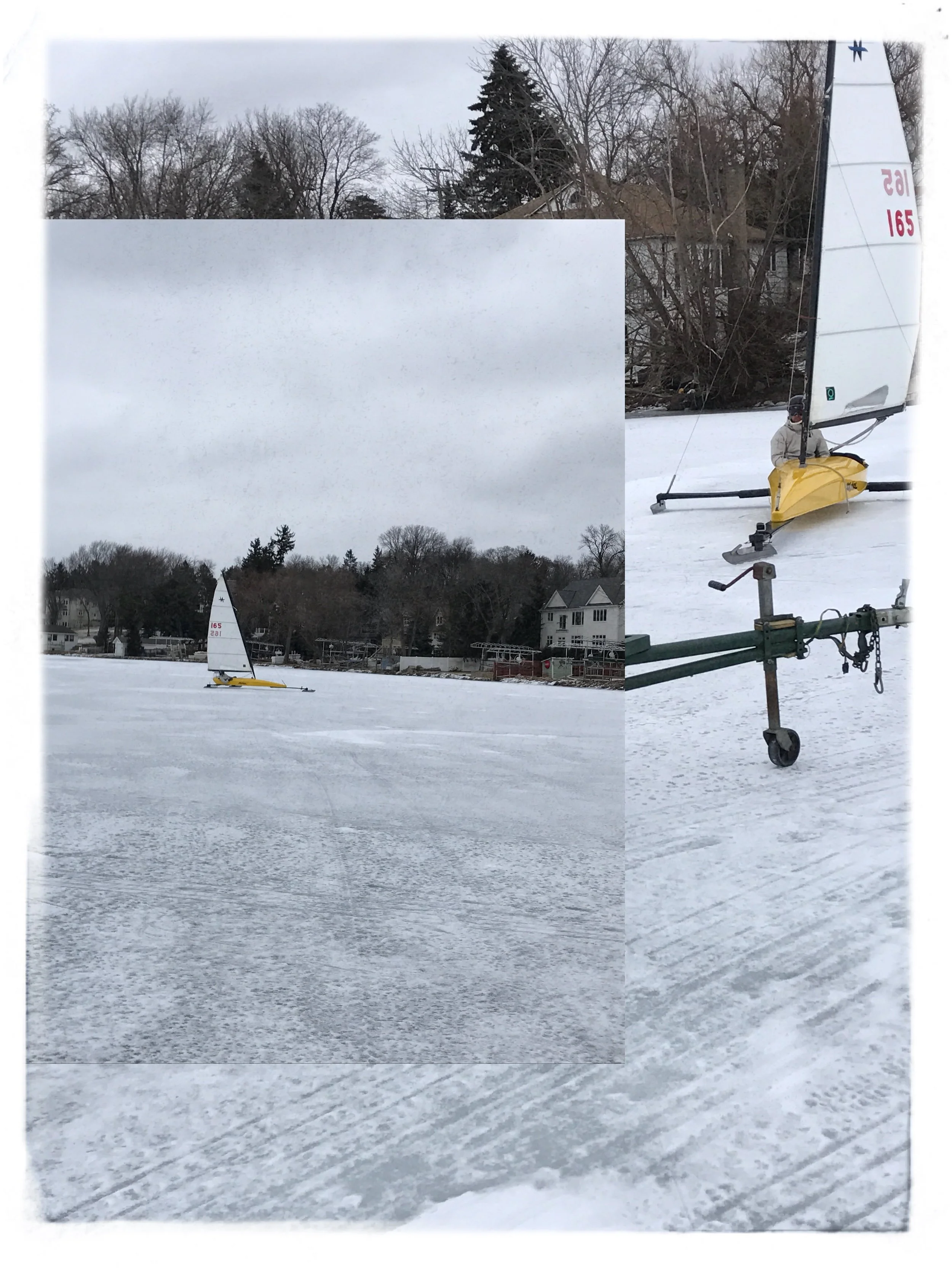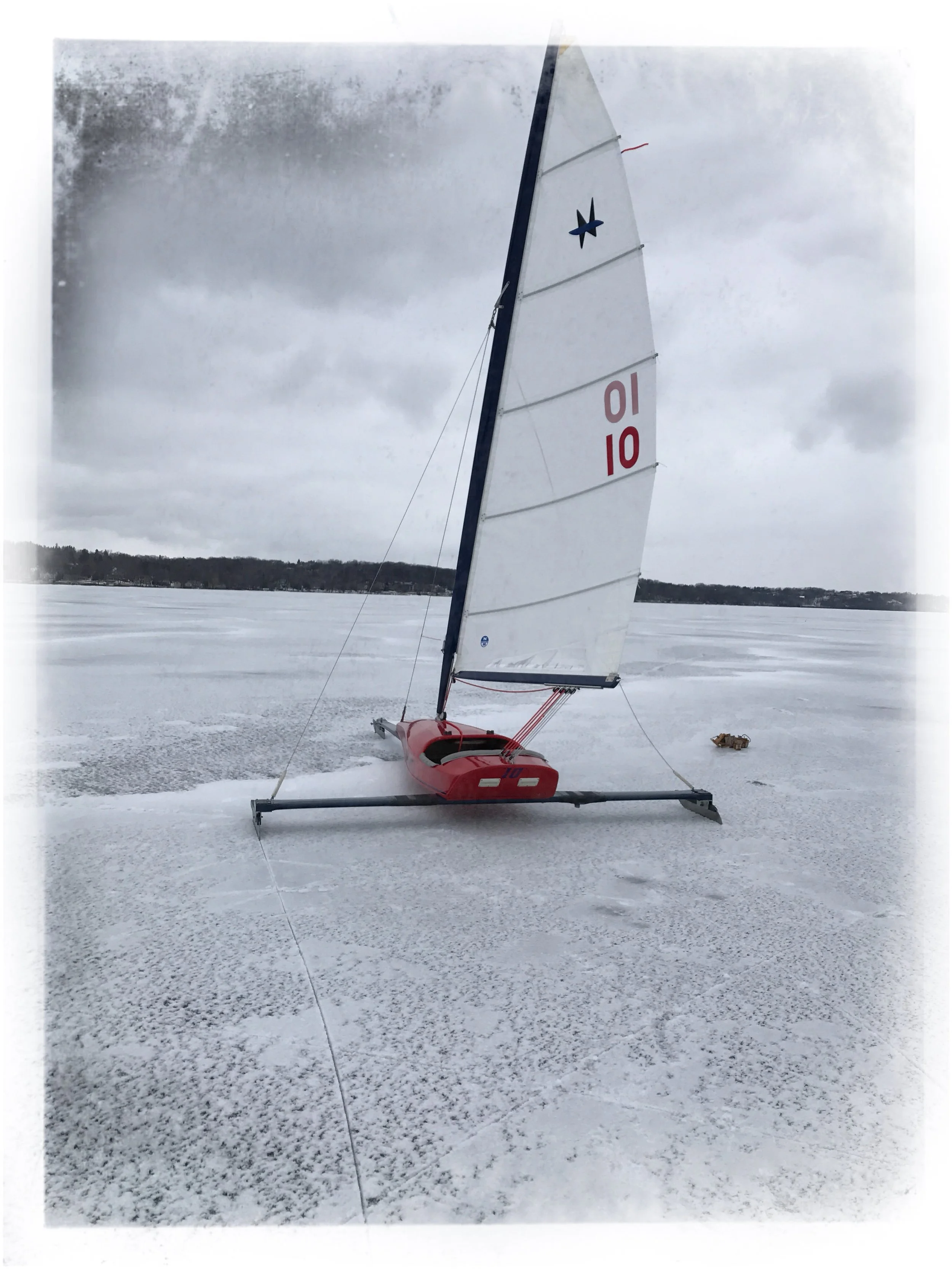 Lots of bending, lifting, kneeling, crawling, pushing and pulling, and that's before the race. And after. With the ice rough and crusty (in other words, sticky) and the wind variable, it was possible to sail into a patch of doldrums, and I seemed to do so in every race. When that happens, you have to get out and push while the other boats go whizzing by. Years ago I vowed I'd never push again, but in the heat of the moment, I seem to have forgot. Too much strenuousity for this particular frame, and on top of that my thumbs were frozen solid for four hours.