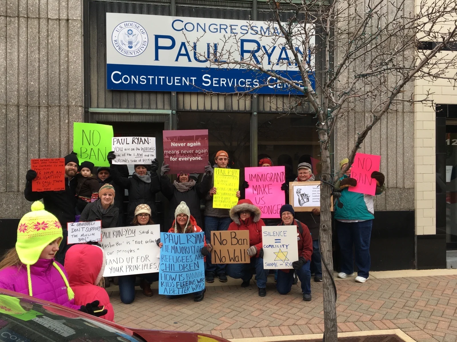 Meanwhile, in light of the immigration and refugee madness emanating from Washington, Abby organized a protest at the office of another politician of little brain.
