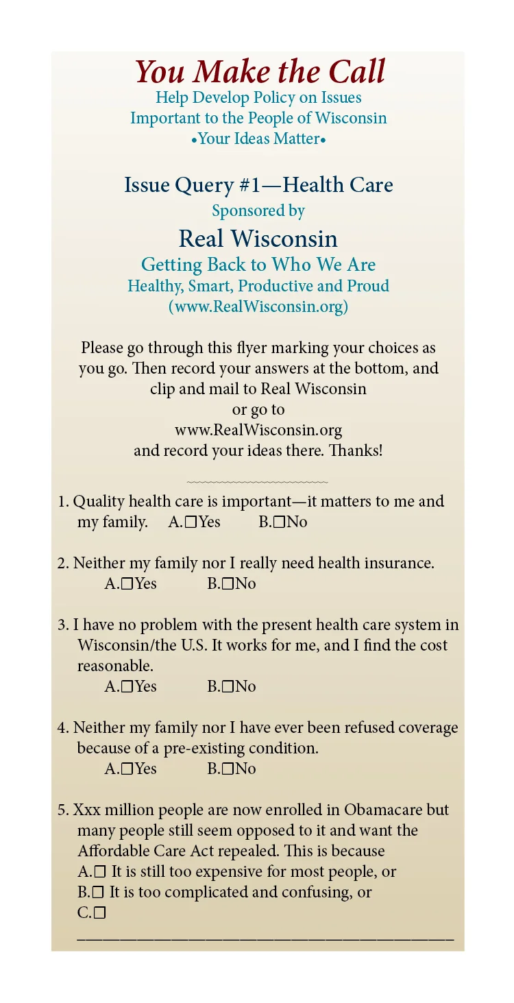 I am therefore badgering (this is Wisconsin, after all) the Party to initiate what I call "The Big Listen." Lots of town-halls, but with ordinary people on the dais and politicians asking the questions. And lots of what might be called questionnaires, on issues like health care, education, the environment, taxes, etc.