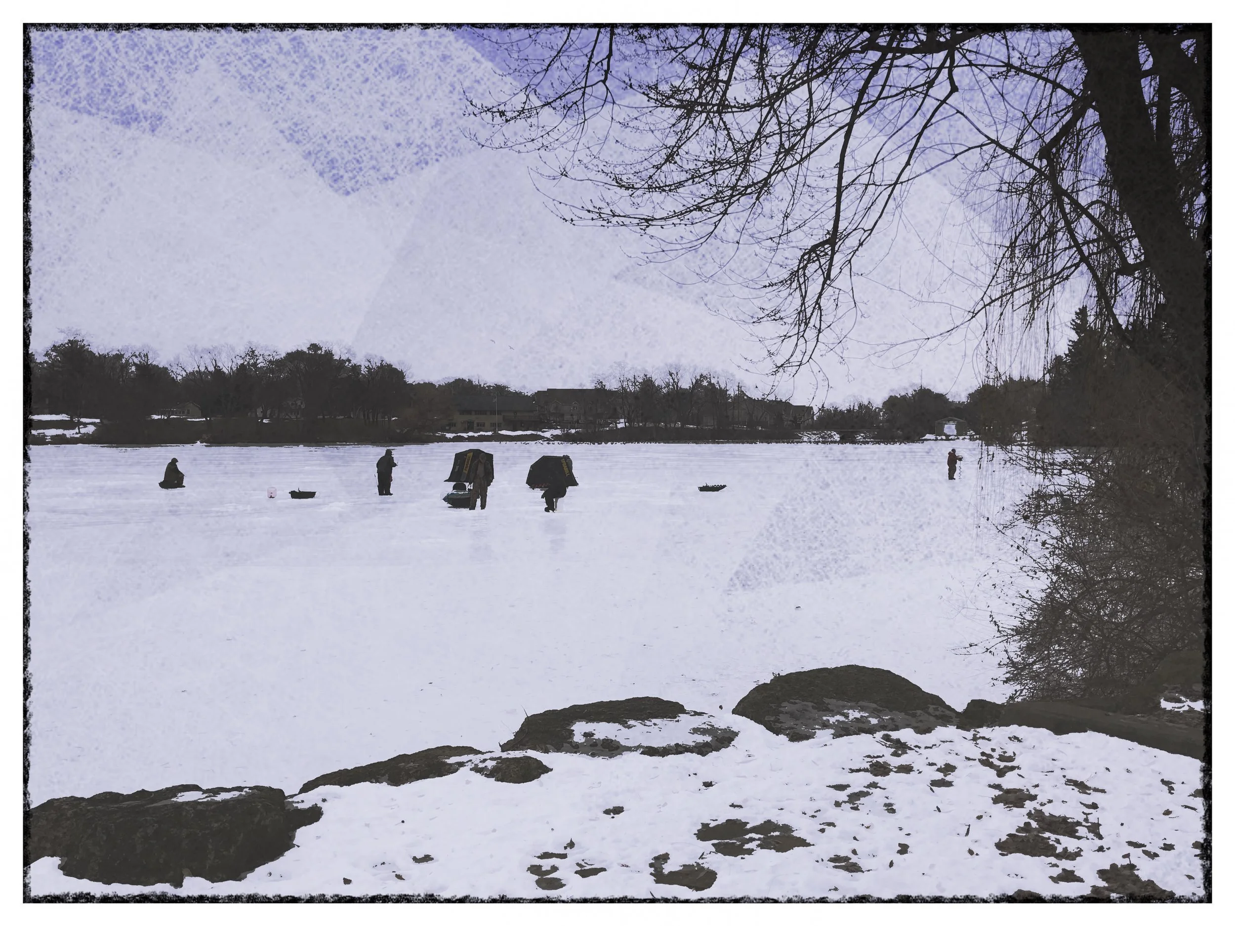 I do believe that if one were to observe any patch of ice bigger than a breadbox, at any time and anywhere that ice had formed, one would find ice fishers and noisy geese. It's in the genes of both species.