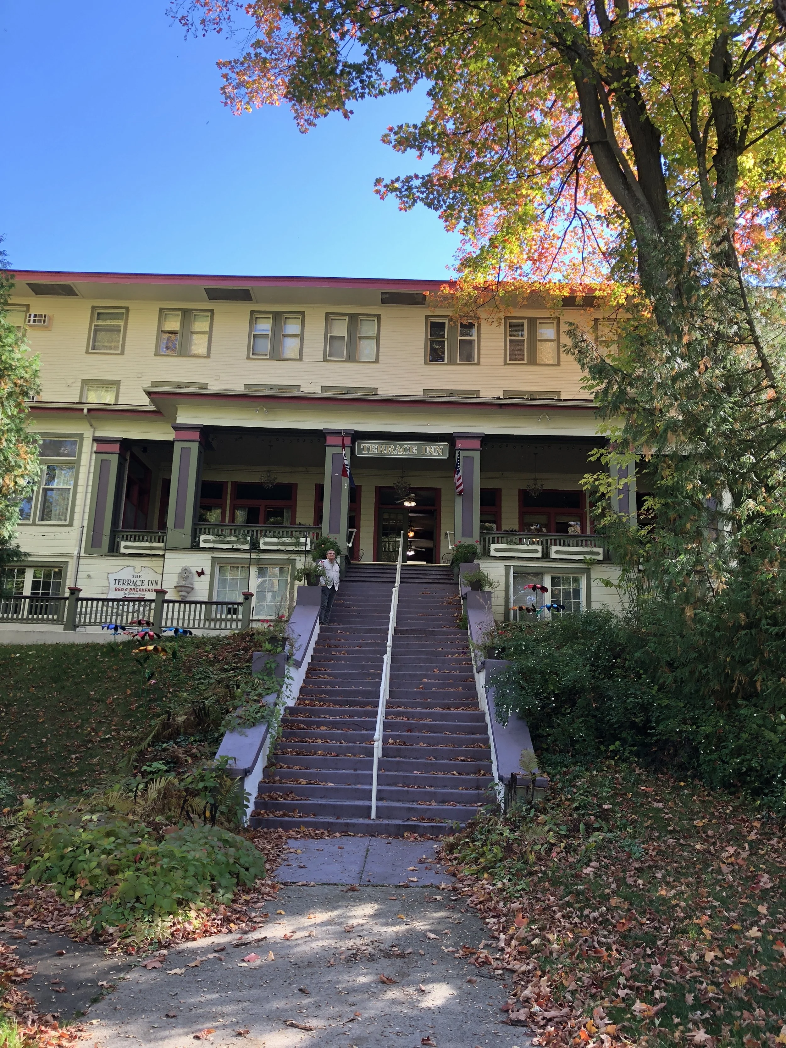Now enjoying a blustery but warm south wind on the long veranda of the Terrace Inn above Little Traverse Bay between Petoskey and Harbor Springs.