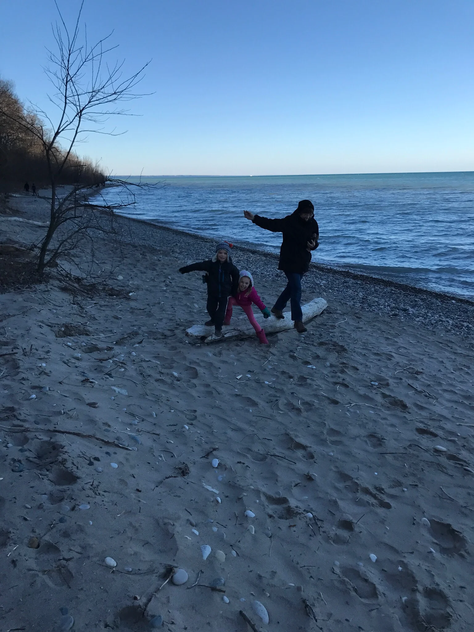 Shifting back to yesterday... A few hours after the wild iceboating, a walk in Doctor's Park down to Lake Michigan, which was not at all frozen. On the beach, we looked out and tried to imagine what was going on across the water.