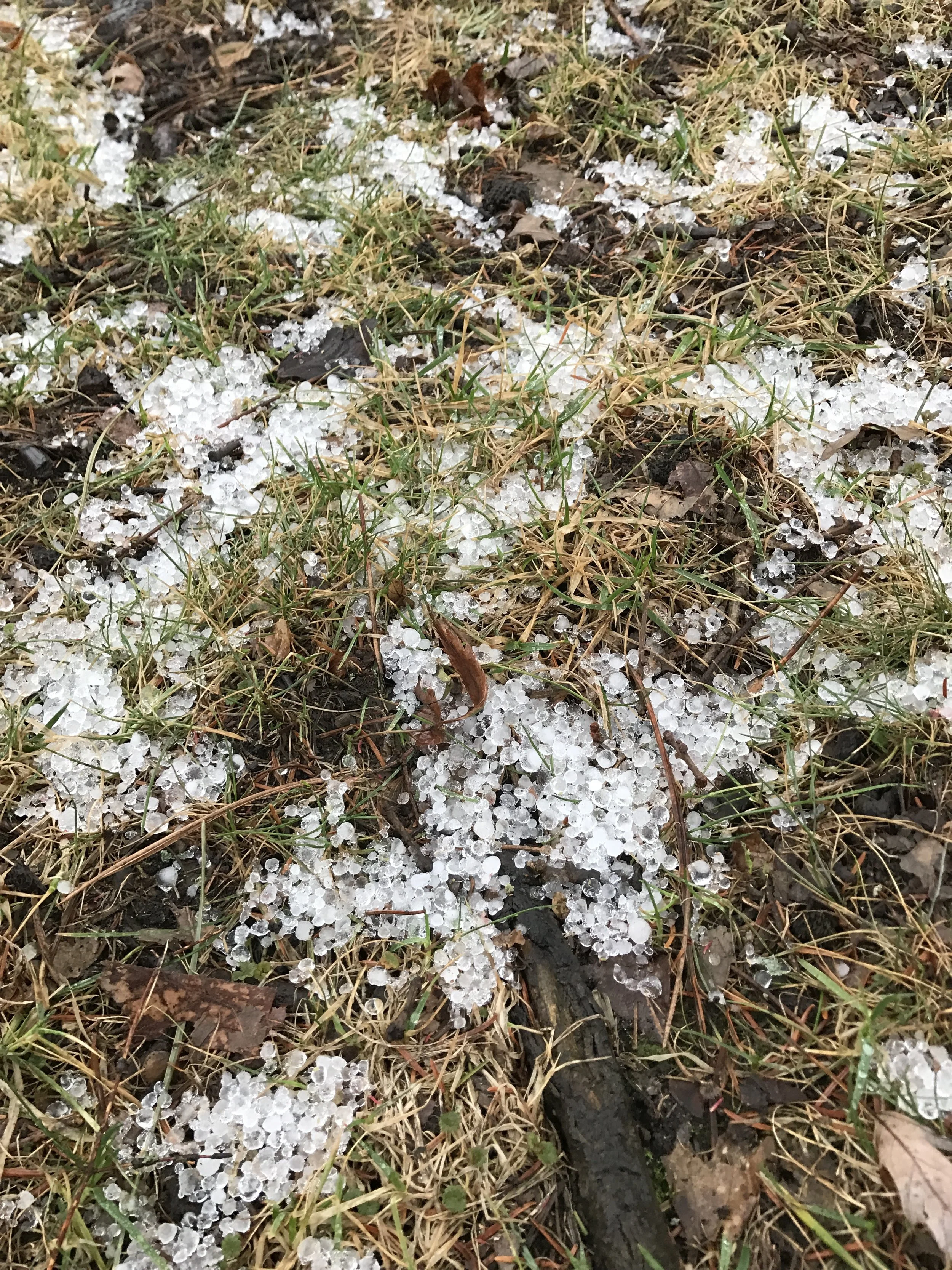 Heavy thunderstorm last night. Intense lightning, loud thunder, lots of precip including much almost perfectly round, clear, crystal ice marbles which rolled off roofs and down downspouts and accumulated in glistening piles. Pax, with Mimi in tow, opted for the basement.