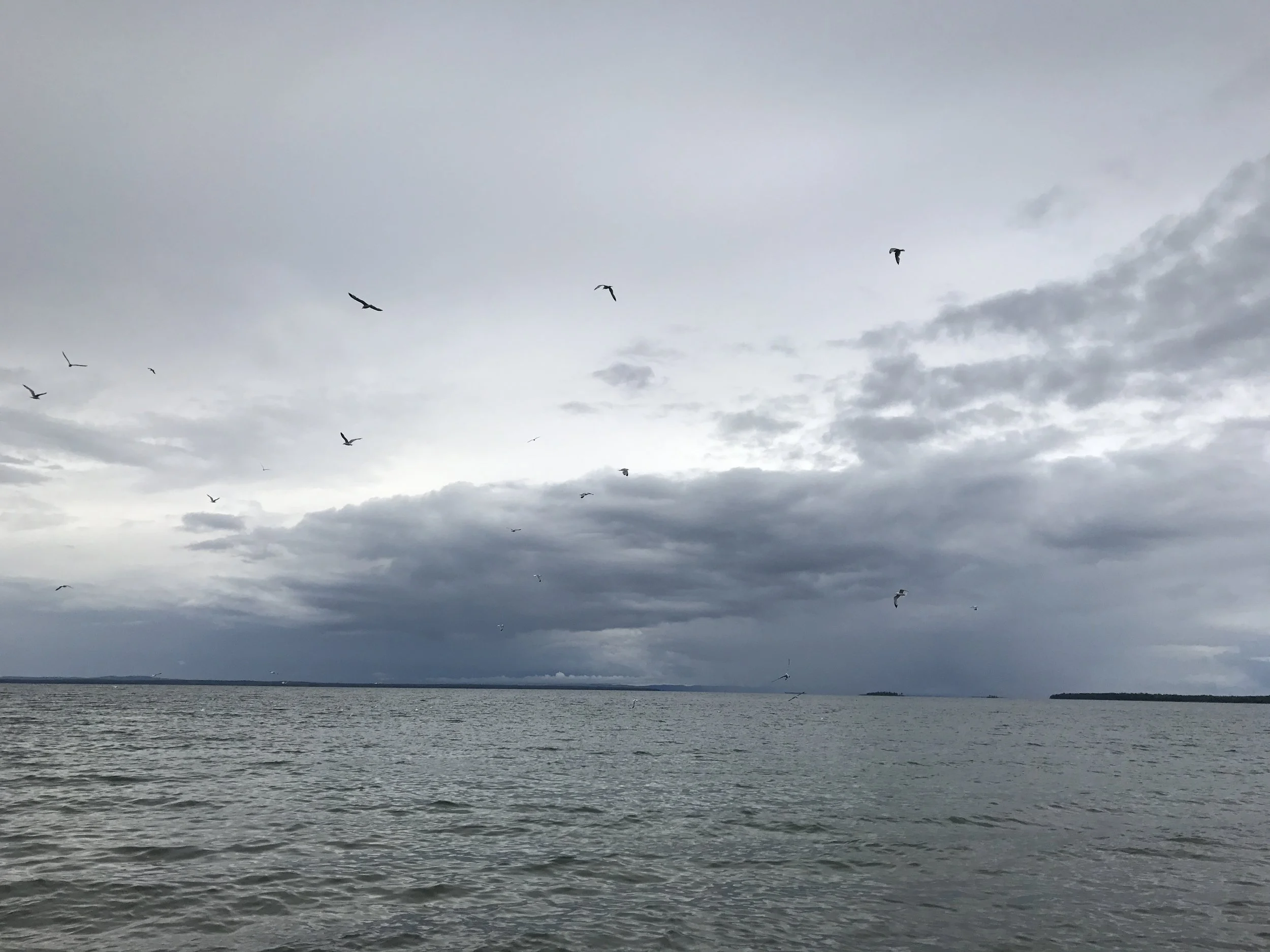 The evening brought clouds, a bit of rain, sun, a flat calm, and a chilly NW breeze.