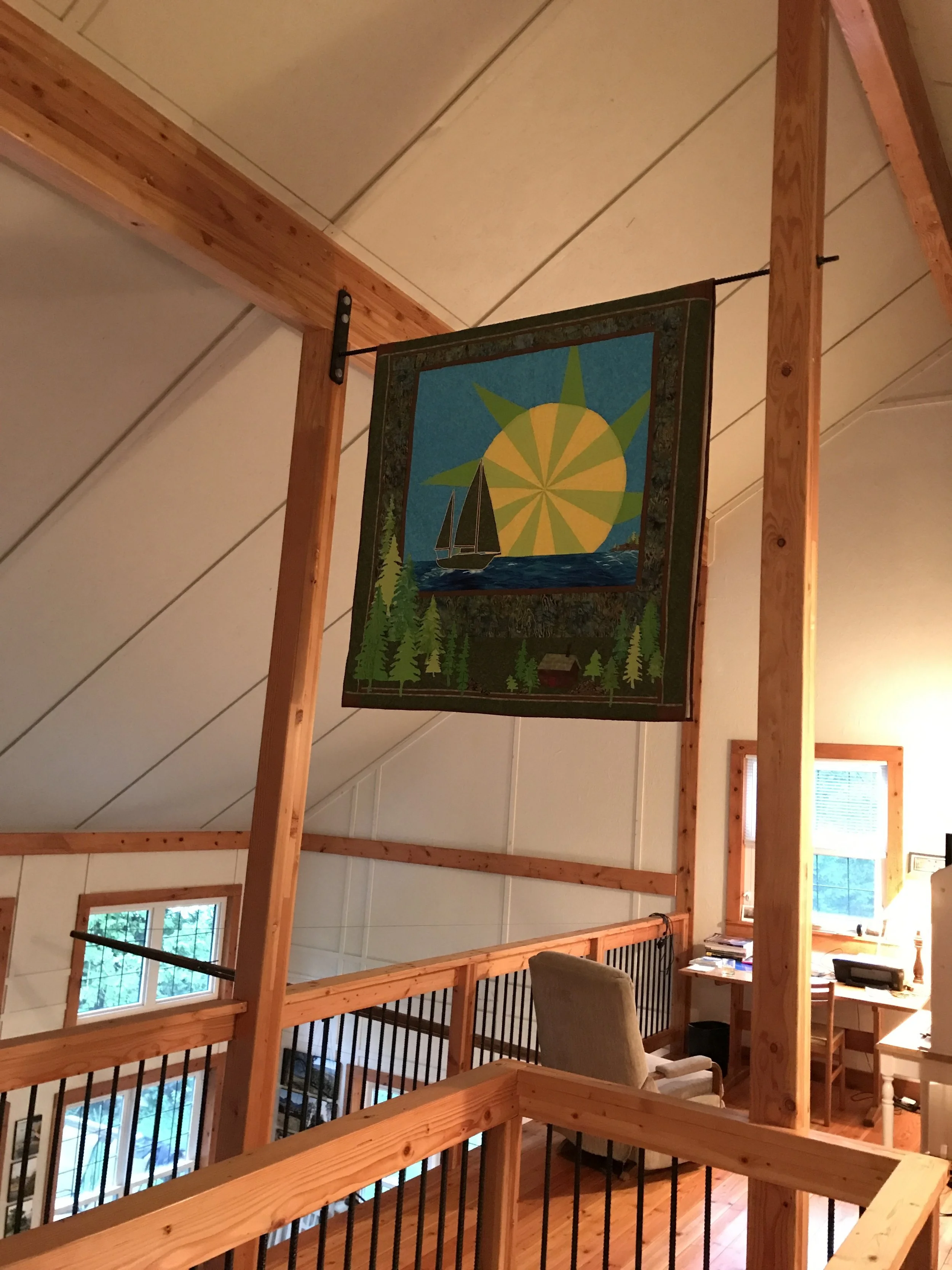 Two years ago, when the Spaldings were here, Jeff, the physicist and audiophile, surveyed the cottage trying to determine how to improve the poor, echoey acoustics. He suggested a baffle between the vertical posts upstairs, to keep sound waves from sloshing back and forth. And now we have such—not just a baffle, however, but a beautiful piece of art.