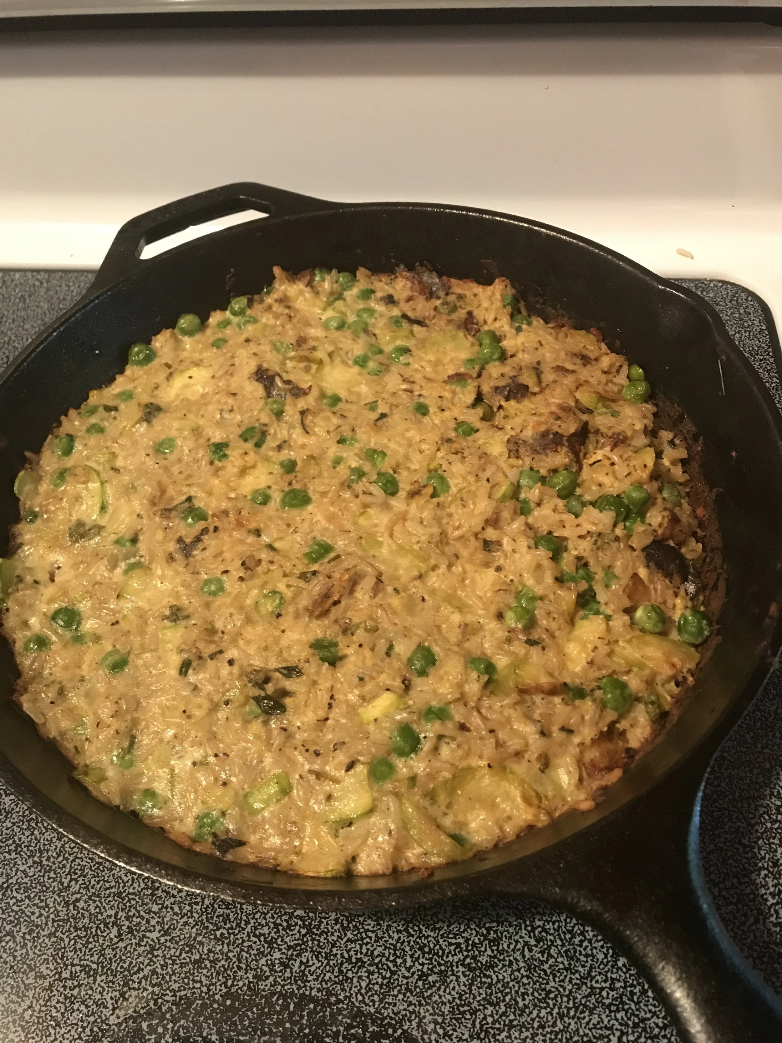 And the pea picking resulted in a Pea-tata, illustrated above. Garden peas plus onion, zucchini, chives, thyme, and brown rice, all tied together by a few eggs.. Recipe available on request.