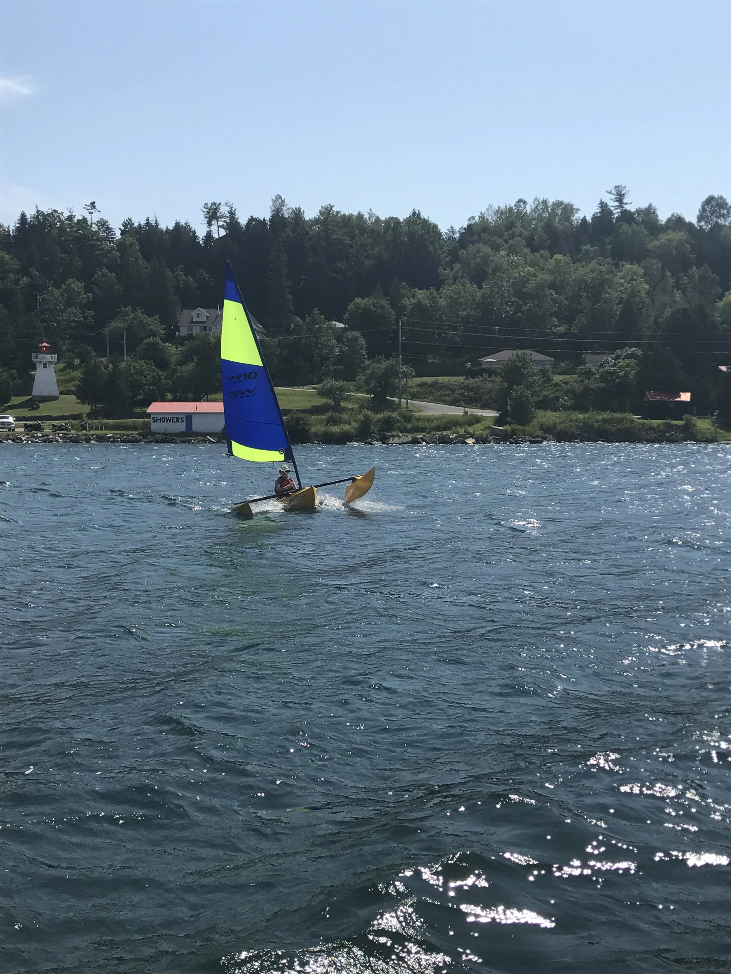 Brunch at JD Greenhouse. Heliotrope out in the bay for a few hours, loping along under mizzen and half jib, with a bone in her teeth. A brief swim (west wind blowing the warm surface water out). Some distant thunder about dinner time, putting Pax off his grub.