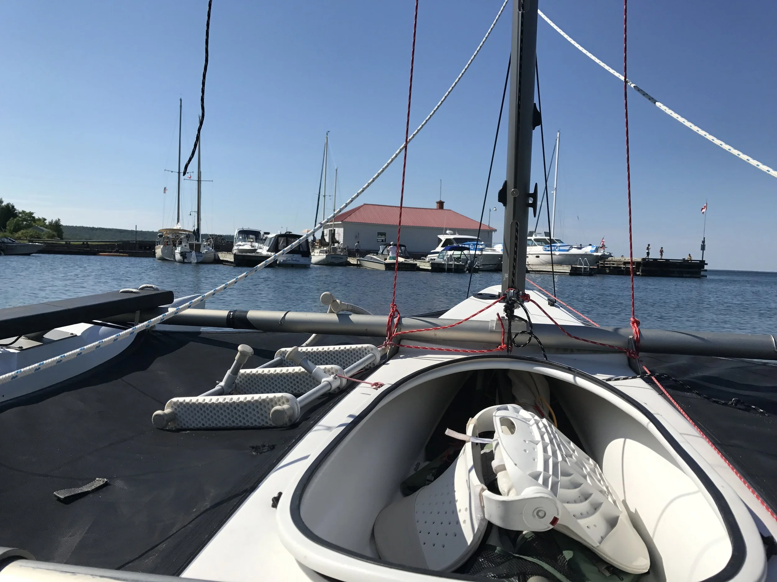 To get away from it all, and to take advantage of a strong south wind, we decided to go for a sail on the Windrider. Once out of the harbor we noticed that a rental 10' Tango sailboat appeared to be in trouble—rapidly being blown down wind and out to sea. Getting a line to him and getting things squared away for a tow took a bit of doing but proved to be good practice. The rescued party expressed much gratitude once back at the beach, and the boat rental agent learned the importance of a chase boat (we hope).