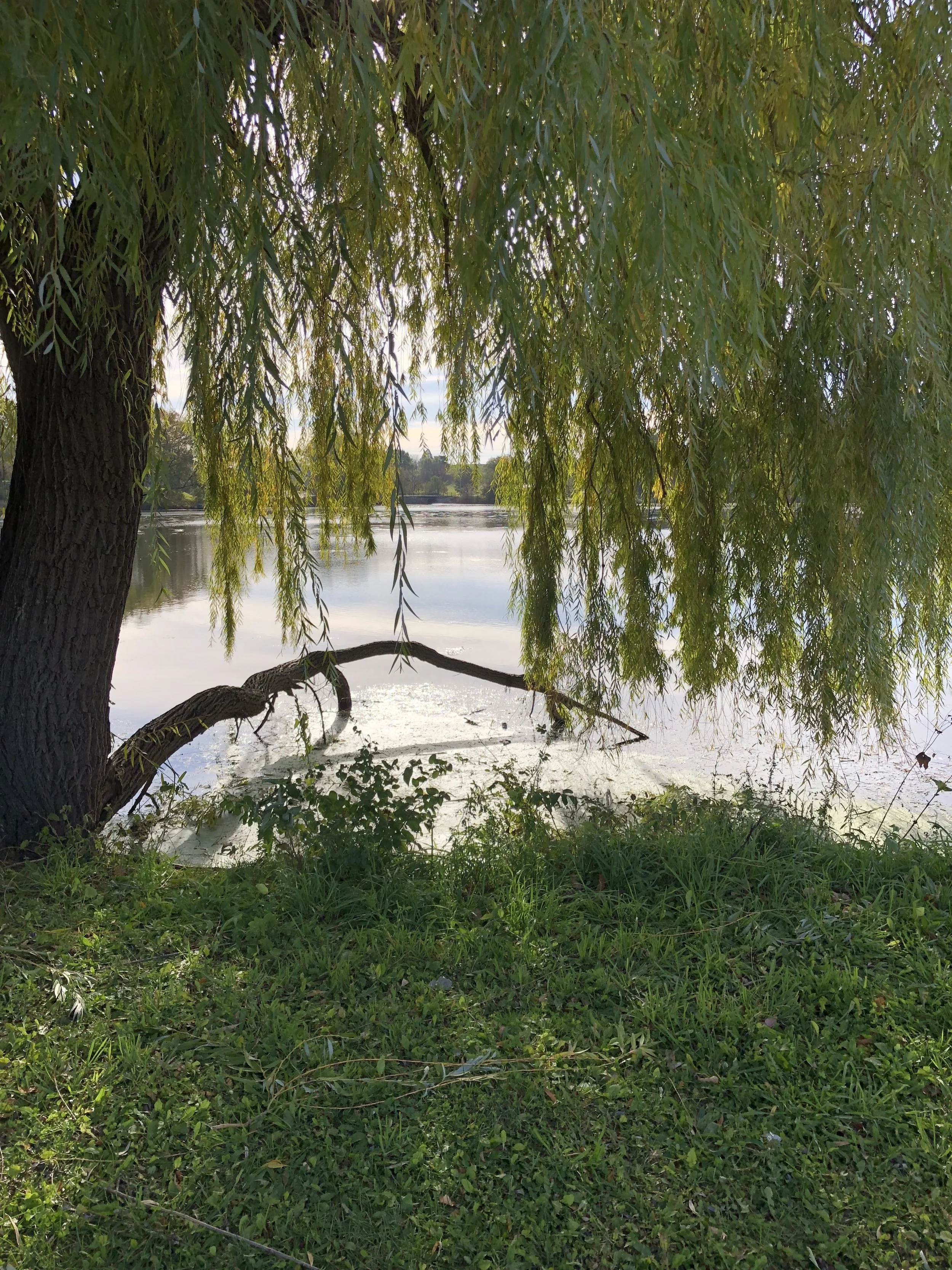 The willow holds on to its green.