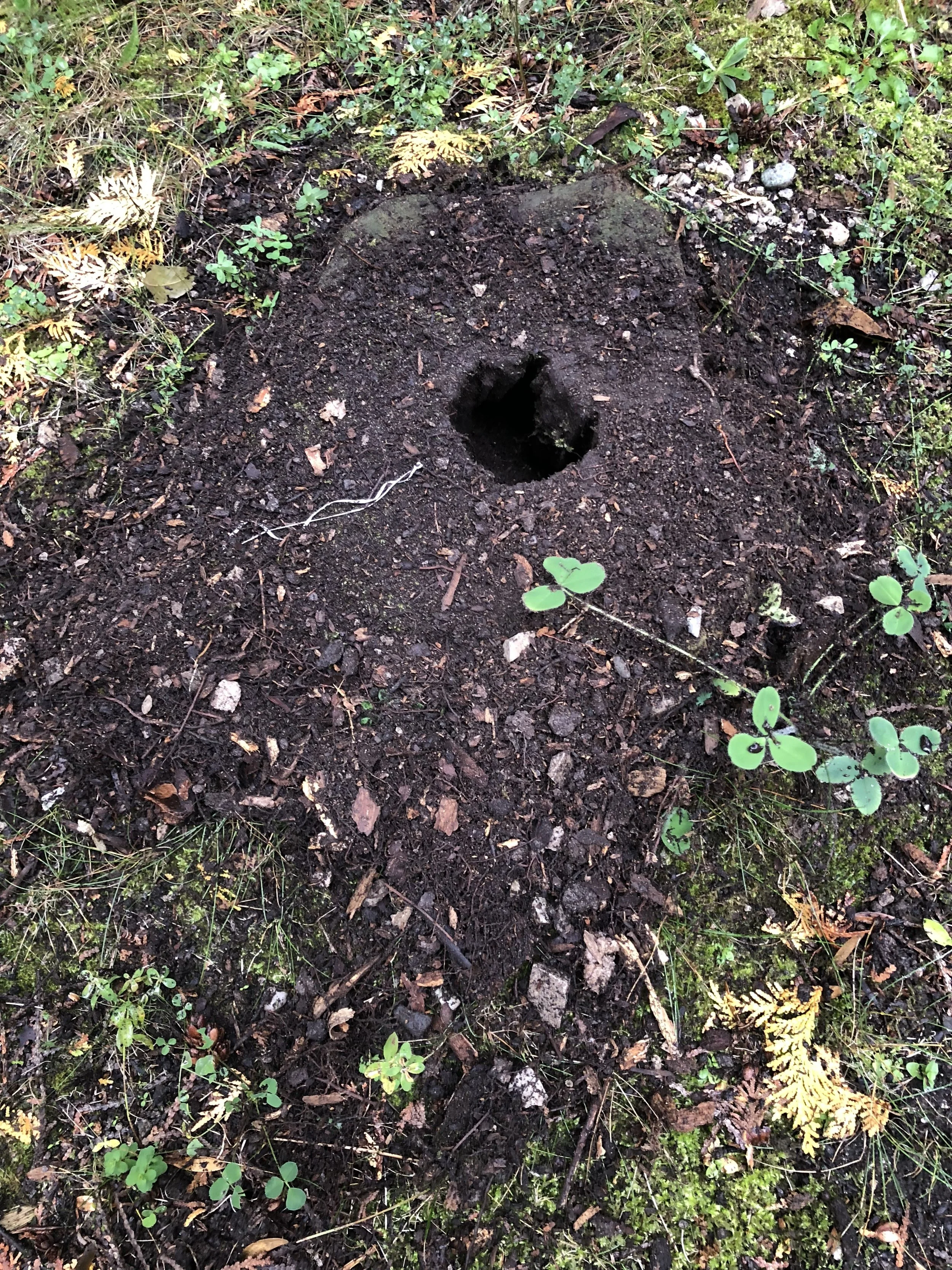 Tamia spent a good part of the day excavating the center of this old stump right outside the back door. She would dive in, grab a mouthful of dirt, pop back up, spit up her load, scratch it behind her, and go back for more. Will this be a new winter home, or perhaps a larder hoard for all the delectables that are being cast outside?