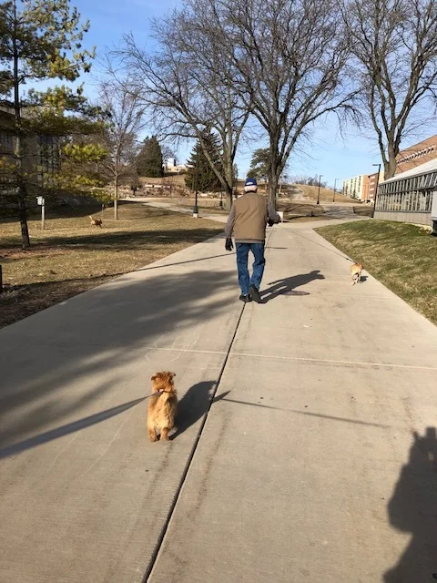 No shortage of dogs, at any rate, here in Whitewater, and this morning we braved the elements and took them all for a good long walk on campus. (It being Sunday, and spring break, we had the whole place completely to ourselves.)