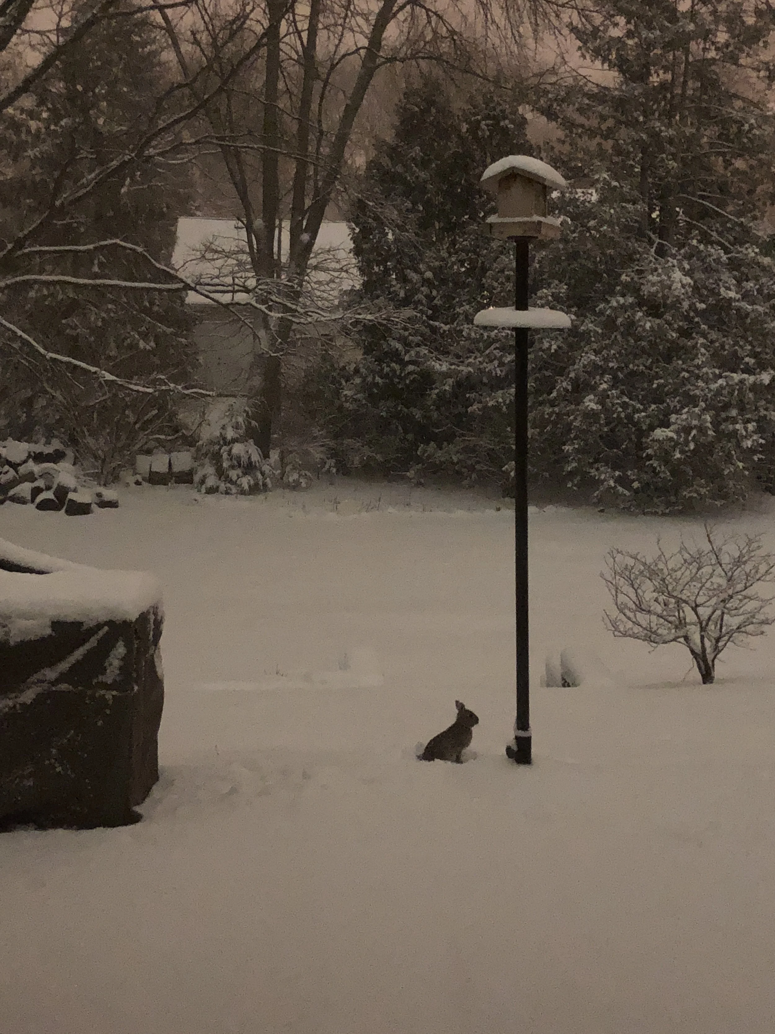 As I look out at the back patio right now I see a small rabbit under the bird feeder, using his head as a shovel to get down to the spilled seed. He seems impervious to the weather.