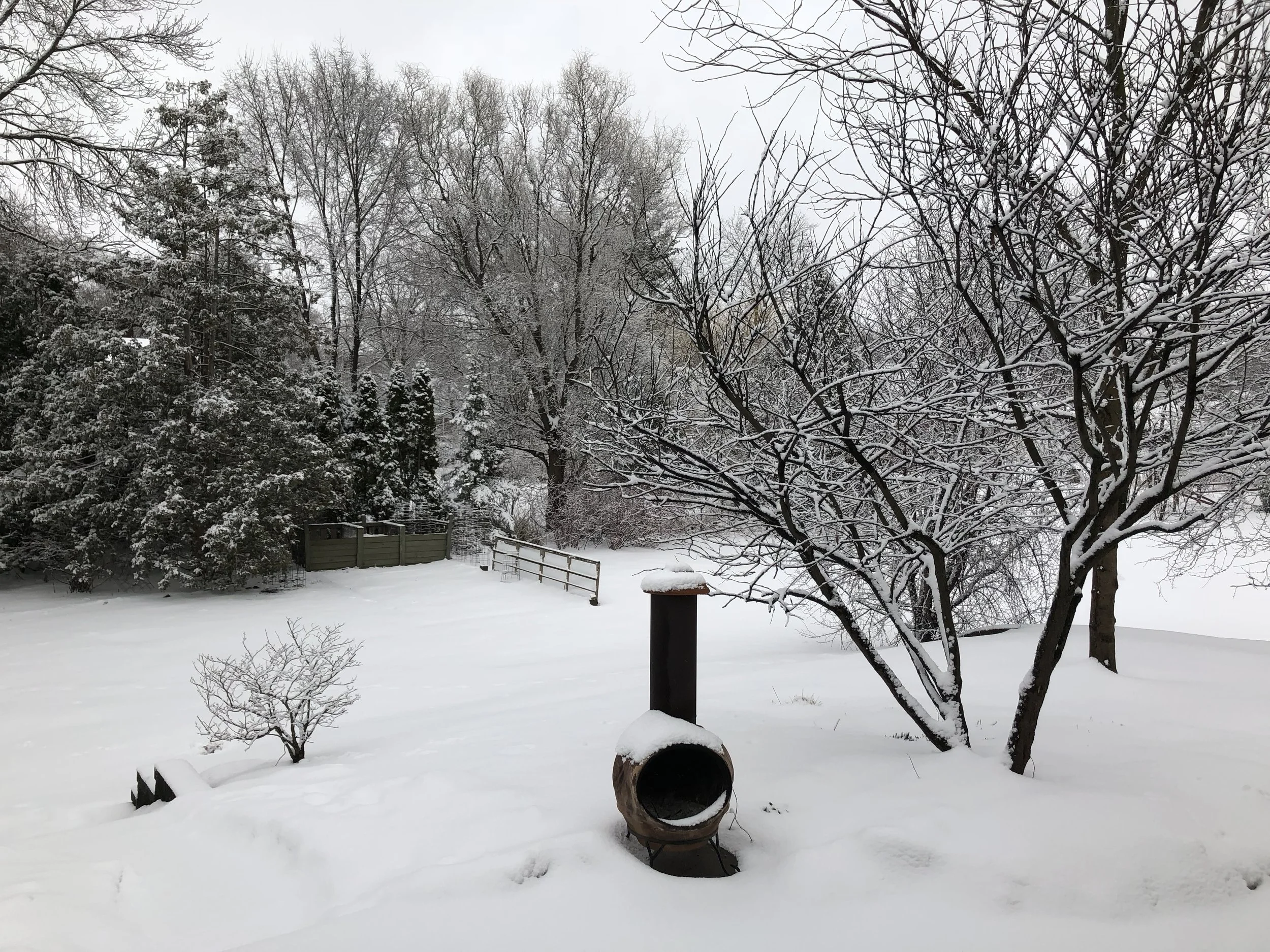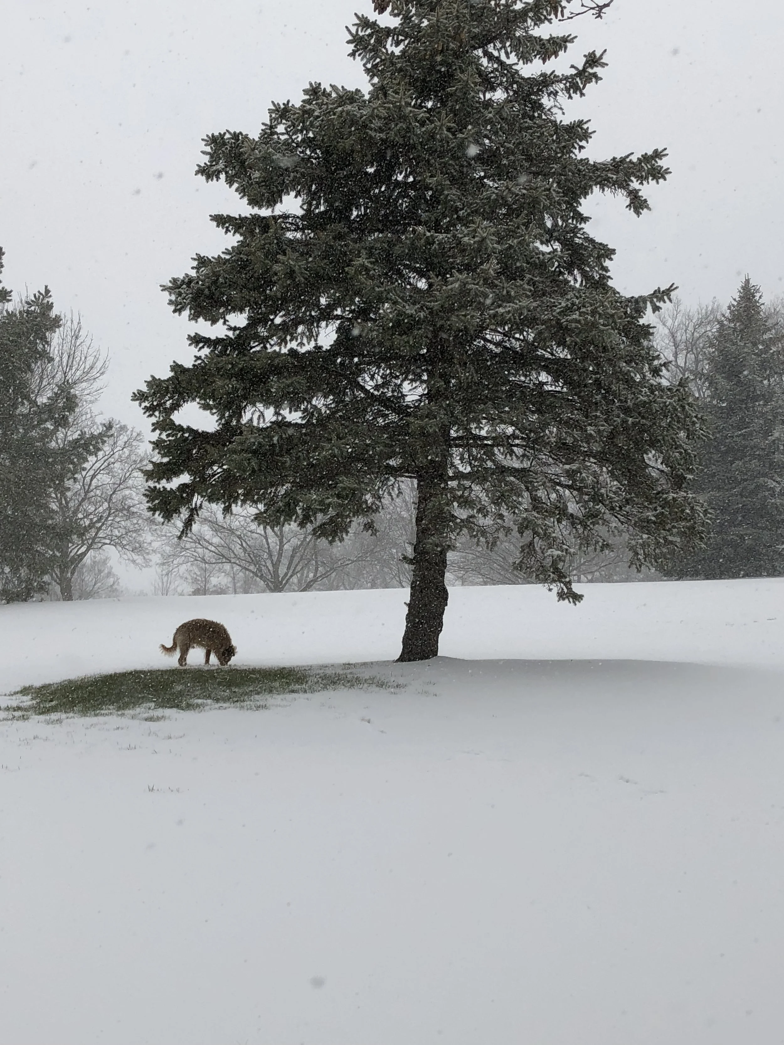 Another 2-3 inches so far, creating a winter wonderland of flocked tress and mounds of white. Pax loves bounding through it, occasionally scooping up a mouthful. But on our walk today we saw a dead bird and no daffodils. Isn't this the latter half or April?