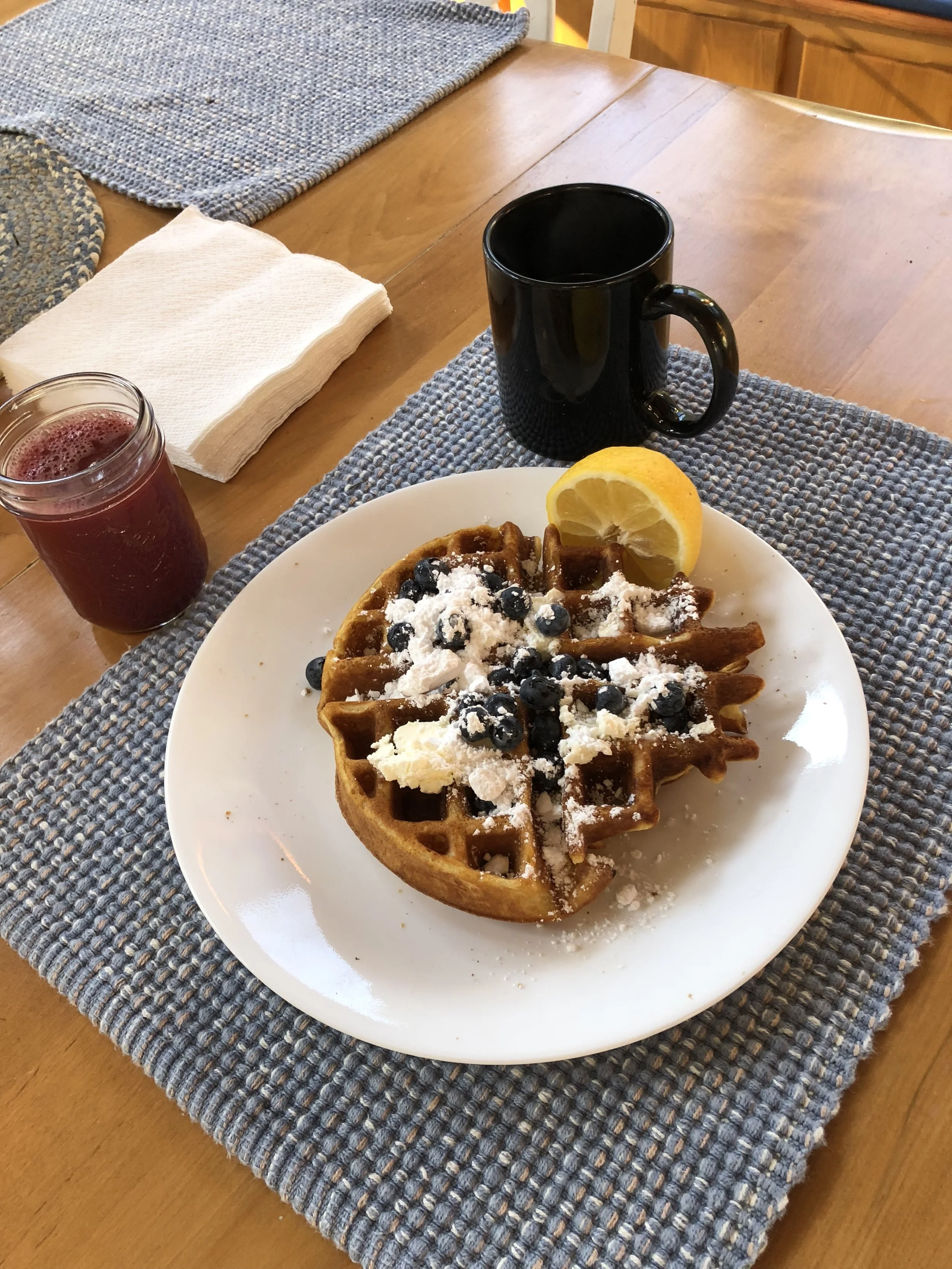... of course not. But it can't be Mother's Day without world famous waffles somewhere. And all was good until we discovered that, although here in the land of trees, we had no maple syrup. Once over the shock we improvised—using jelly, strawberries, and my favorite, blueberries dusted with powdered sugar and then drizzled with fresh lemon juice.