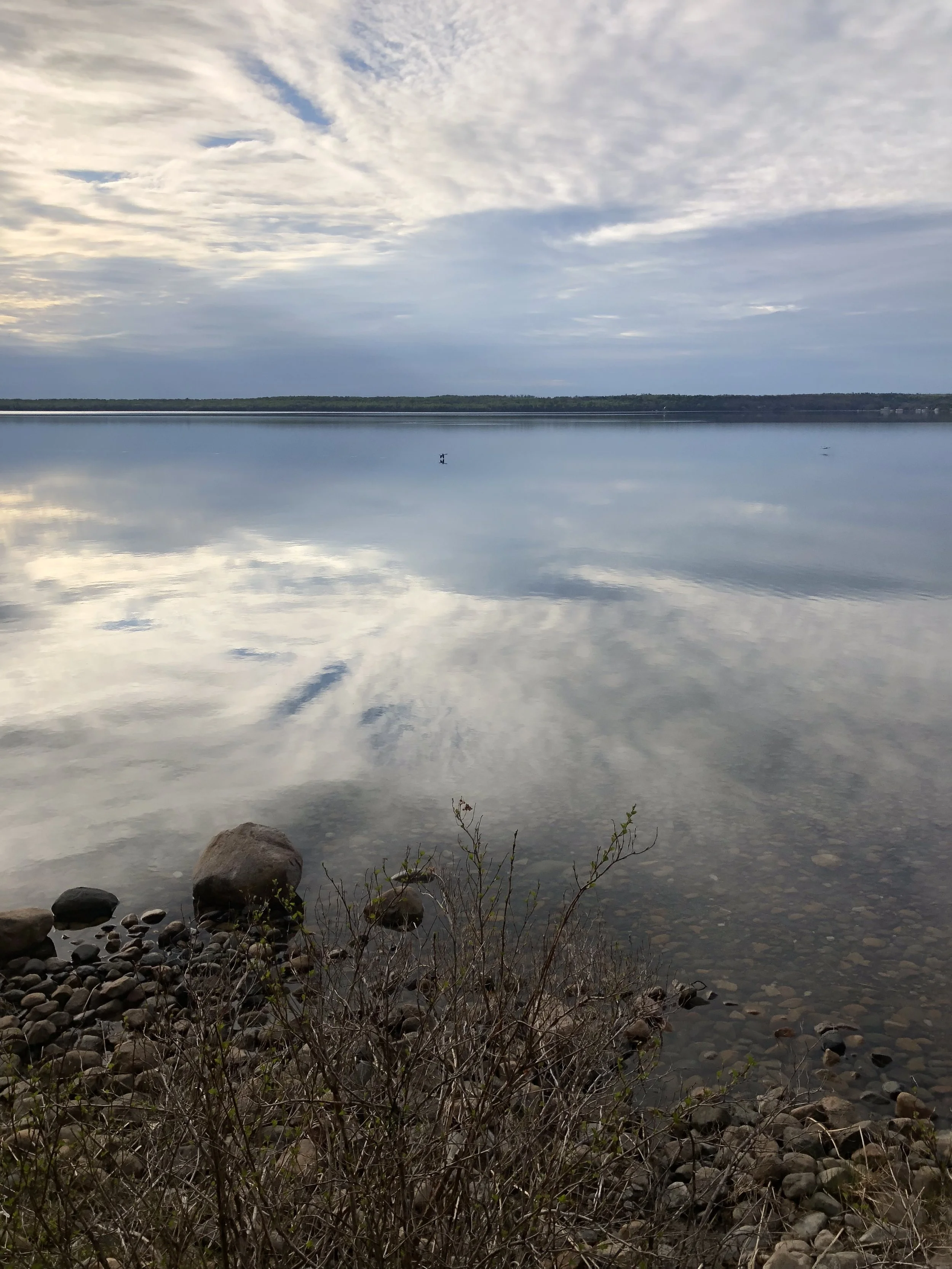 Flat calm all day, until now. Now a substantial west wind coming down the bluff swaying the treetops and sending cats paws across the bay. Two jays sitting just outside the porch watching us as we watch them. The only sound—birds and wind.