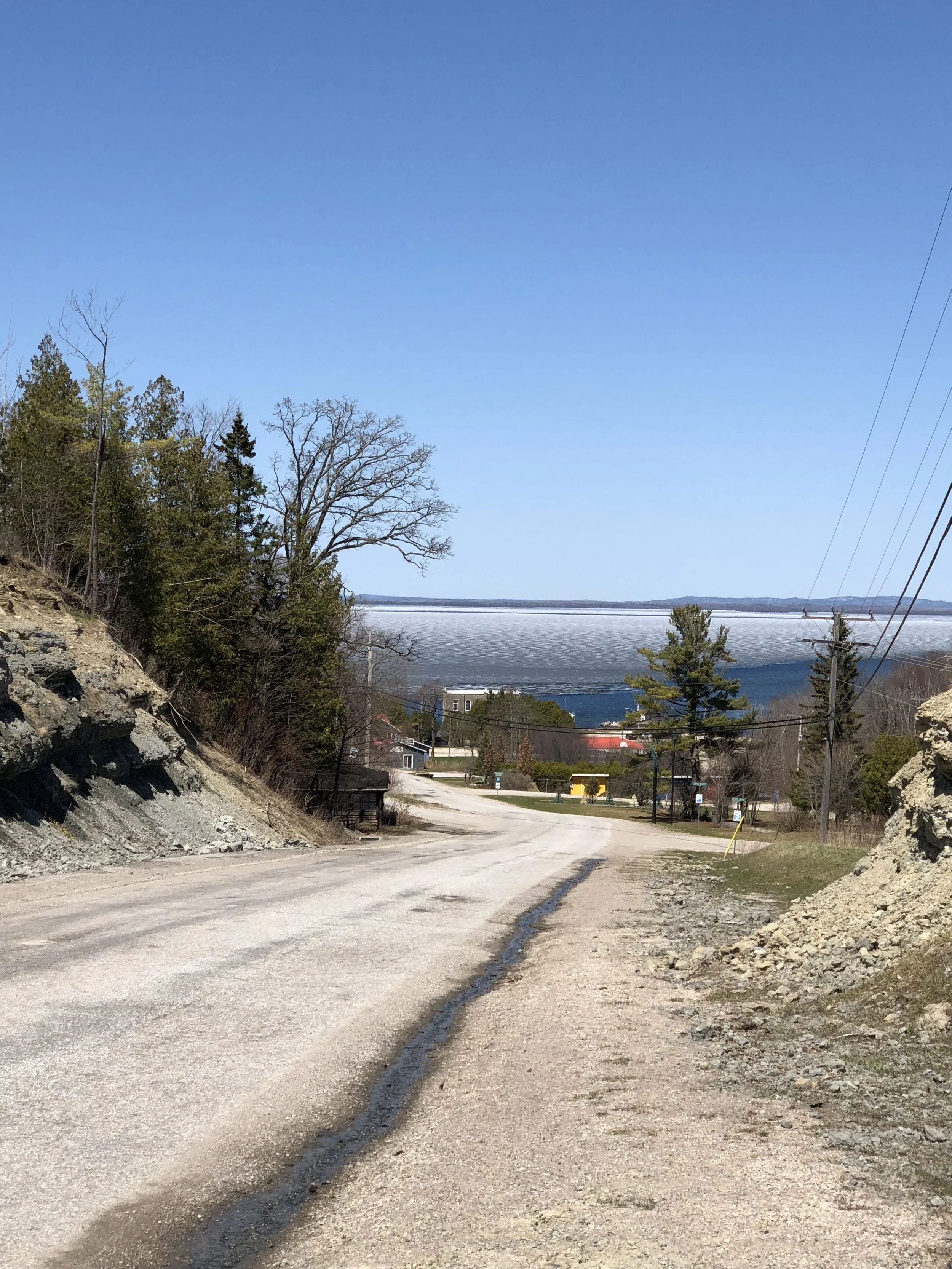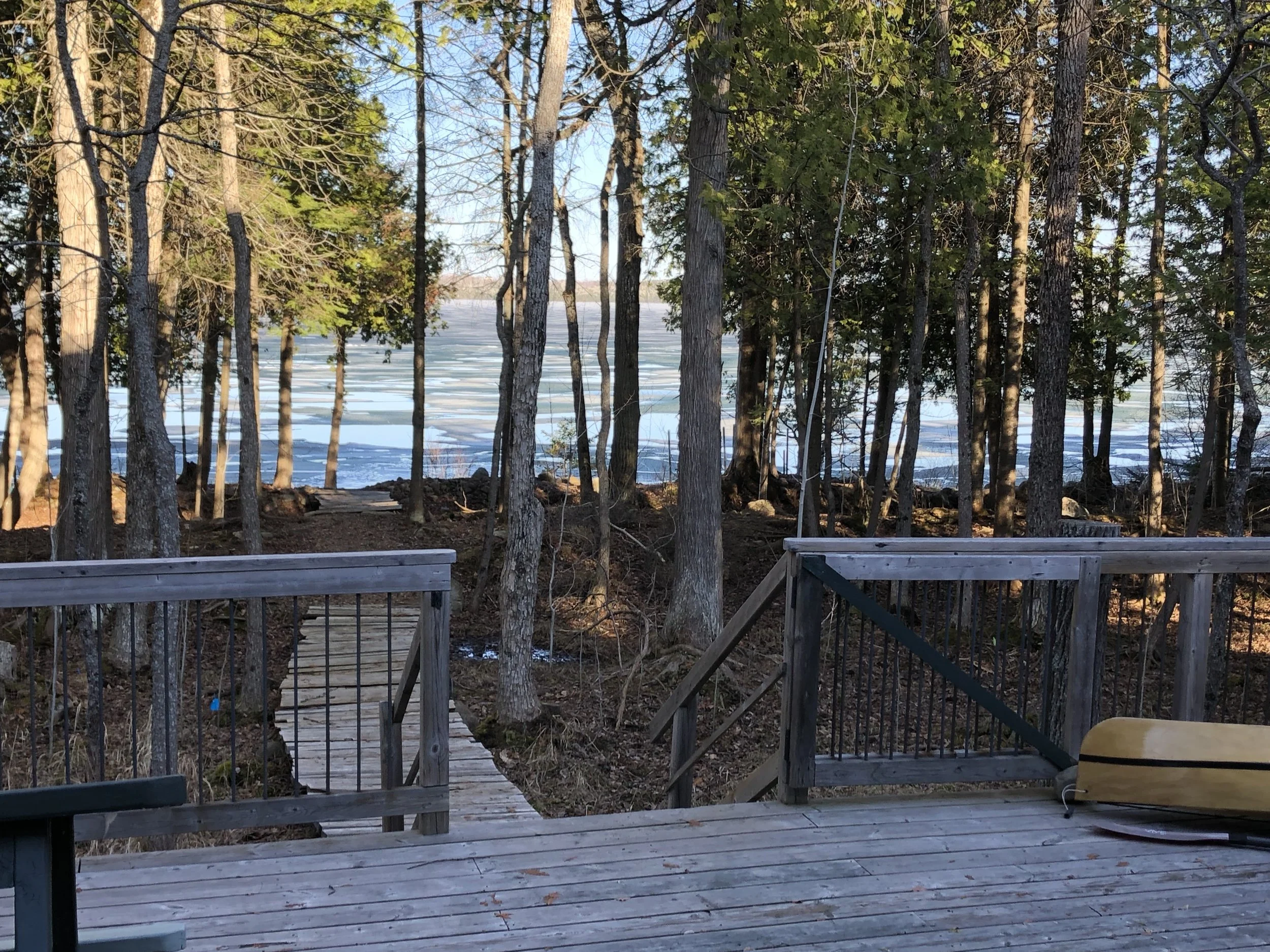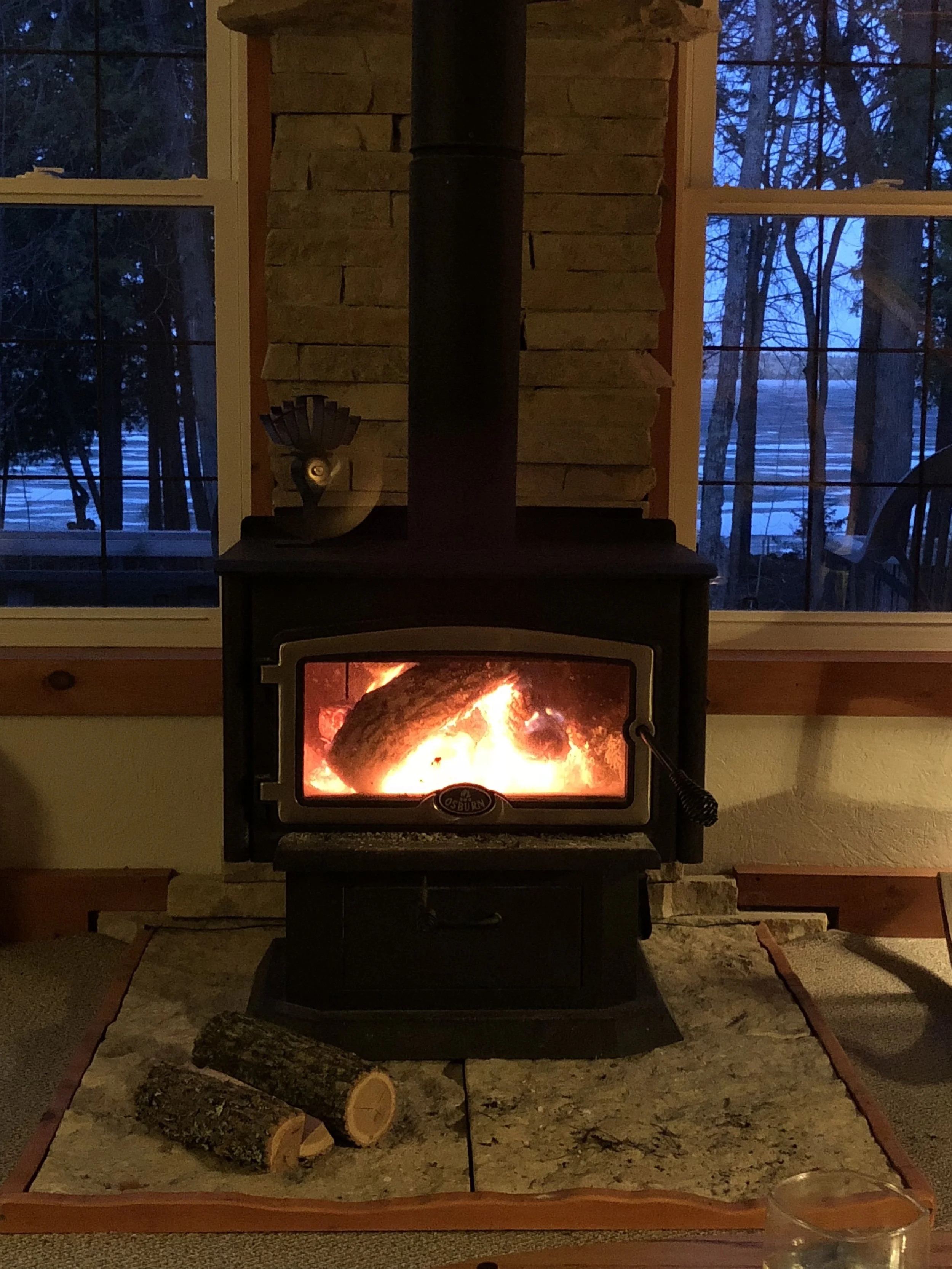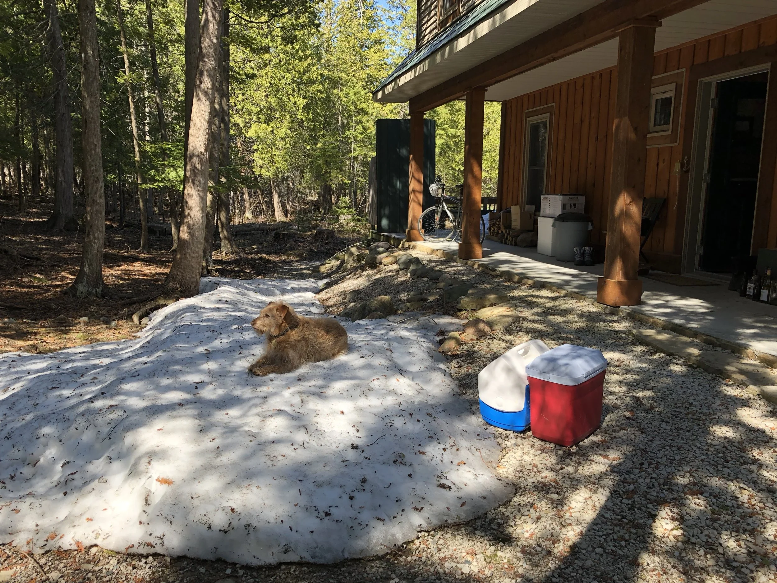 ...and a roaring fire in the stove. WiFi remains the last big hurdle. (TG for LTE.) Had to use the Suzie P as an icebreaker, but the floes were mostly rotten. Warm and sunny up by the garage but a nice cool breeze coming off the ice.