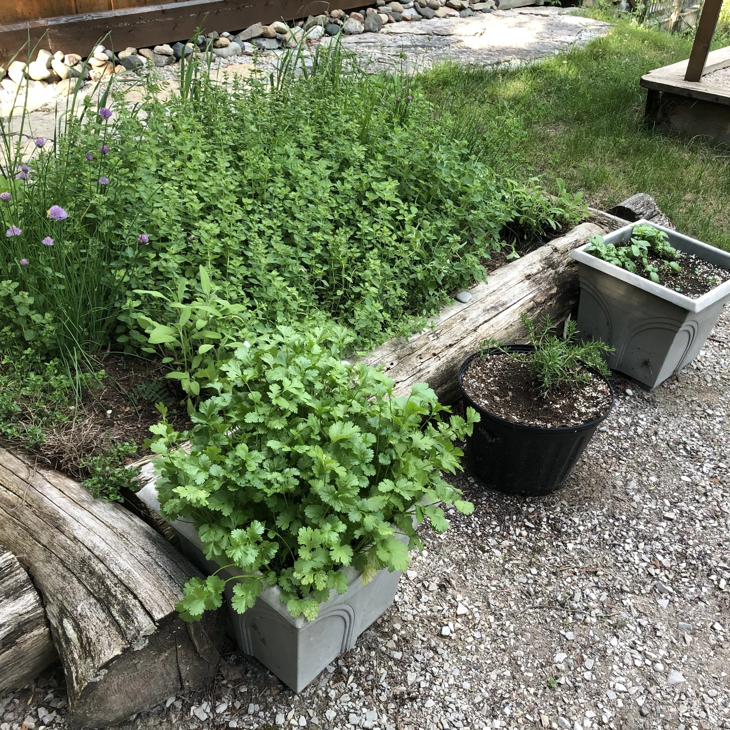 Very dry on Manitoulin, but everything still green, including the herb garden (although to be honest, it gets watered). Front row, left to right, cilantro, rosemary, and basil. Farther back, the world's largest crop of oregano, along with thyme, sage, summer savory, chives, and garlic.