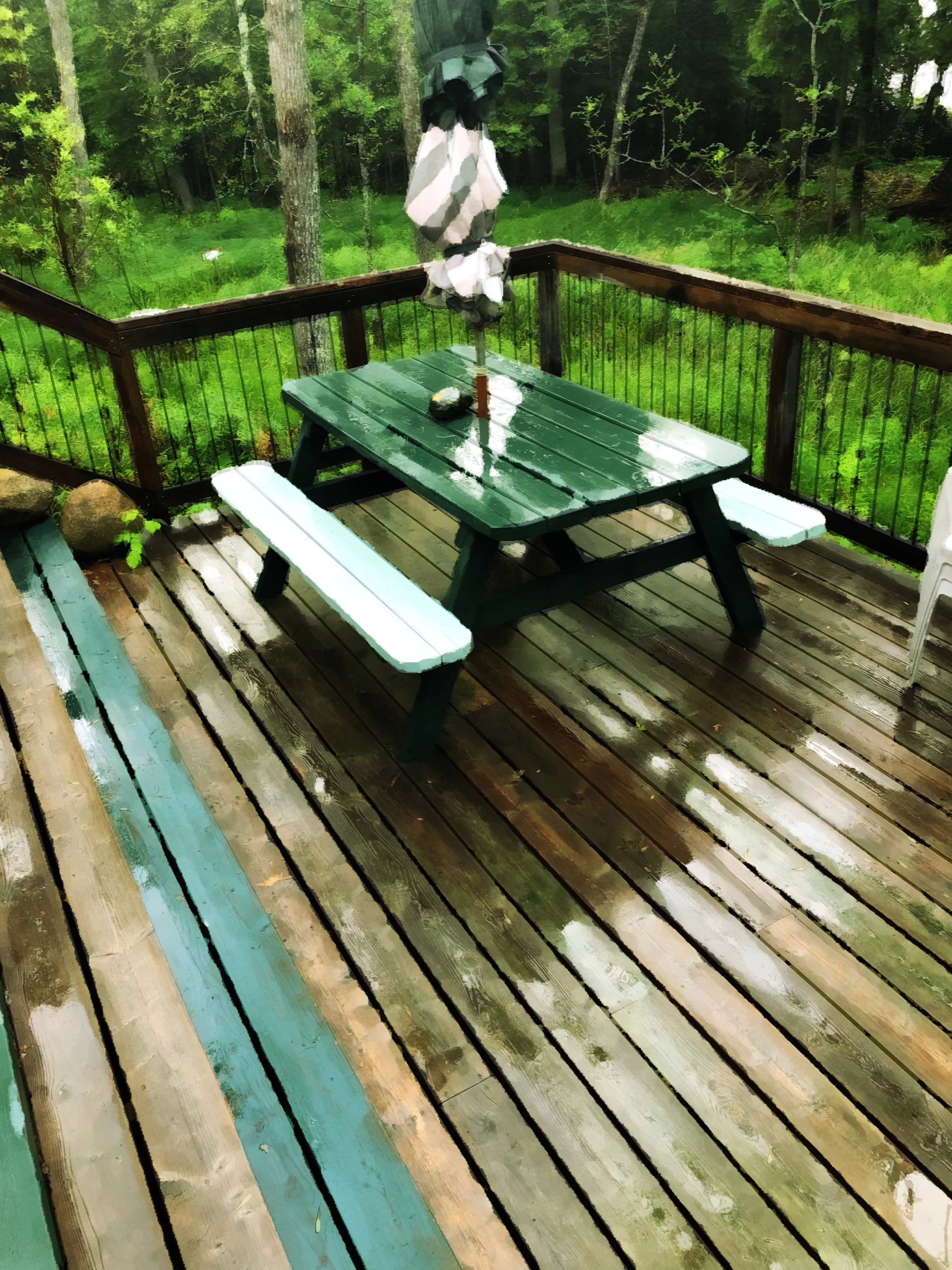 Nighttime storm, plus brief morning cloudburst. Twenty-five gallons in Geode alone. Fire ban still in effect, but the drought, I think, has been broken.