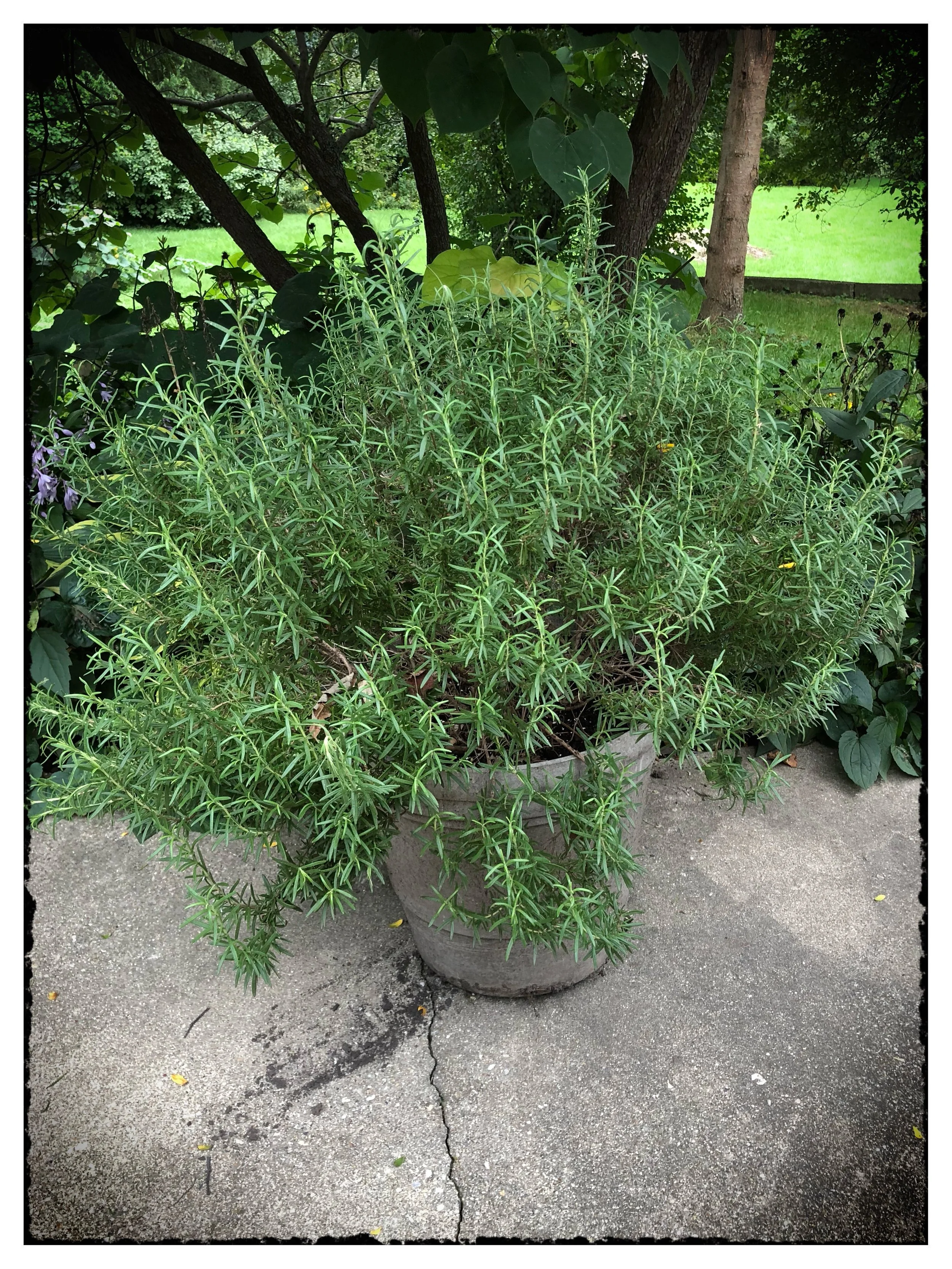 The potted rosemary has spent the summer under the spreading backyard apple tree. Apparently it has found the location congenial, though I think it was too shaded. This particular plant is about four years old, I believe, and, of course, spends the winter indoors. Anyone need a bit of rosemary?