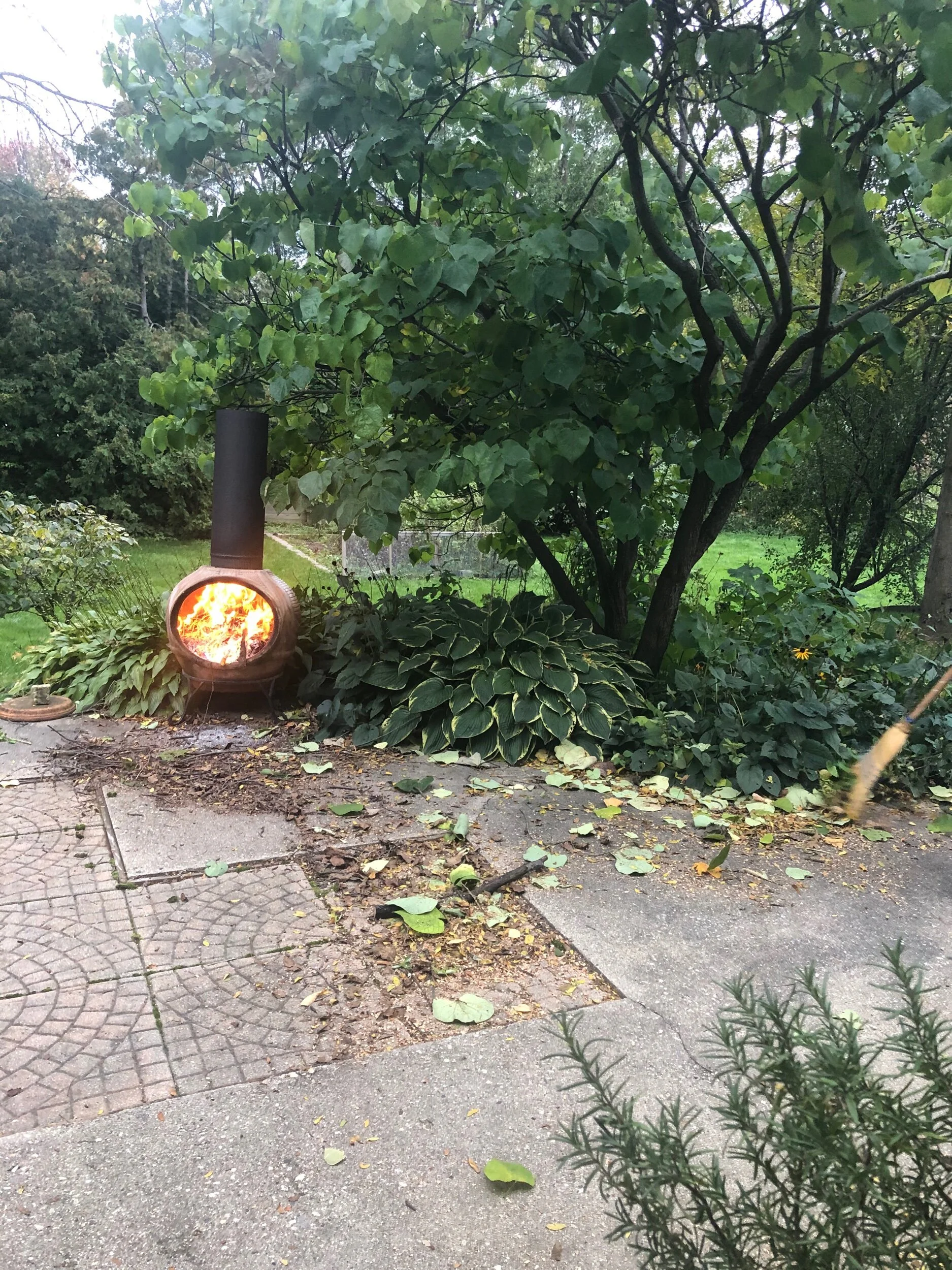 Deadwood pruned from apple tree, and then, along with other brush, donated to the chiminea. All part of getting ready for winter.