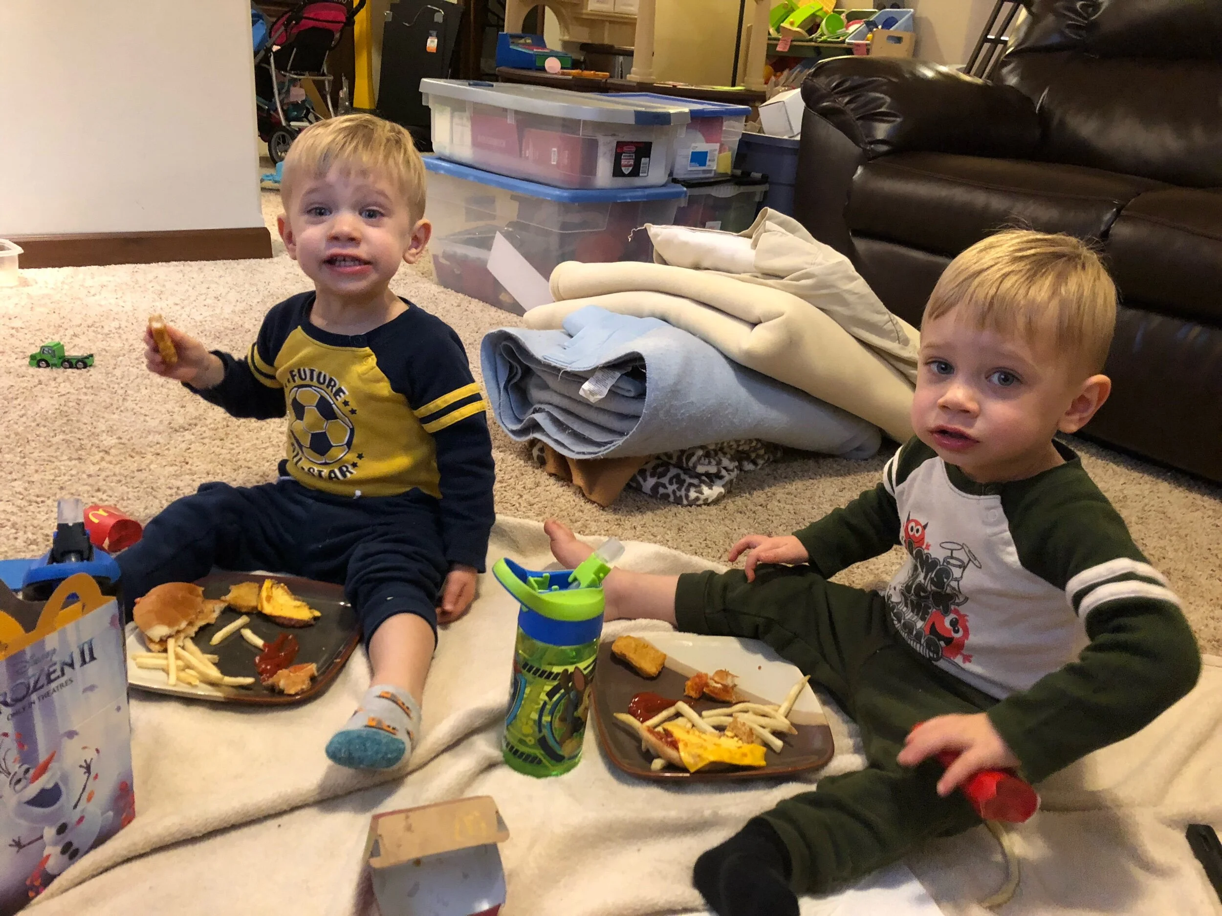 In the afternoon, to Oconomowoc to help out a bit, where Mimi had been filling in most of the day. Below, Mimi and the boys devouring some takeout.