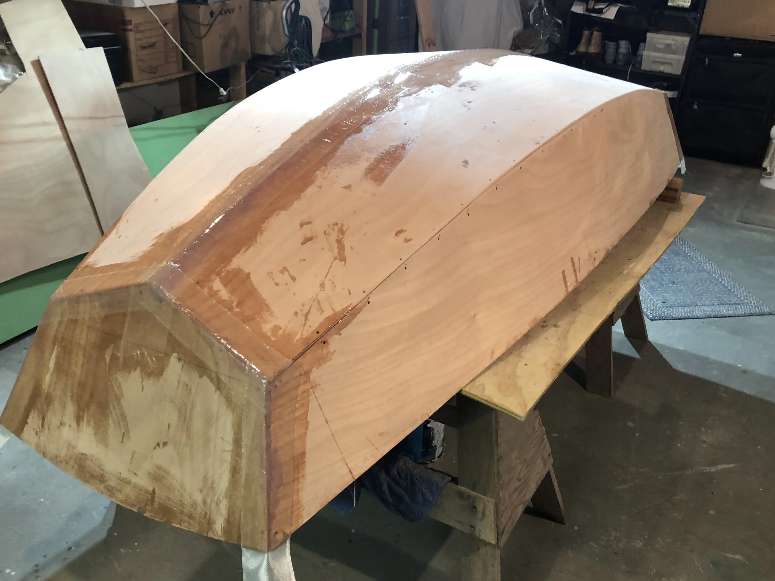 The dinghy has been rolled over, and now the exterior is getting the treatment.