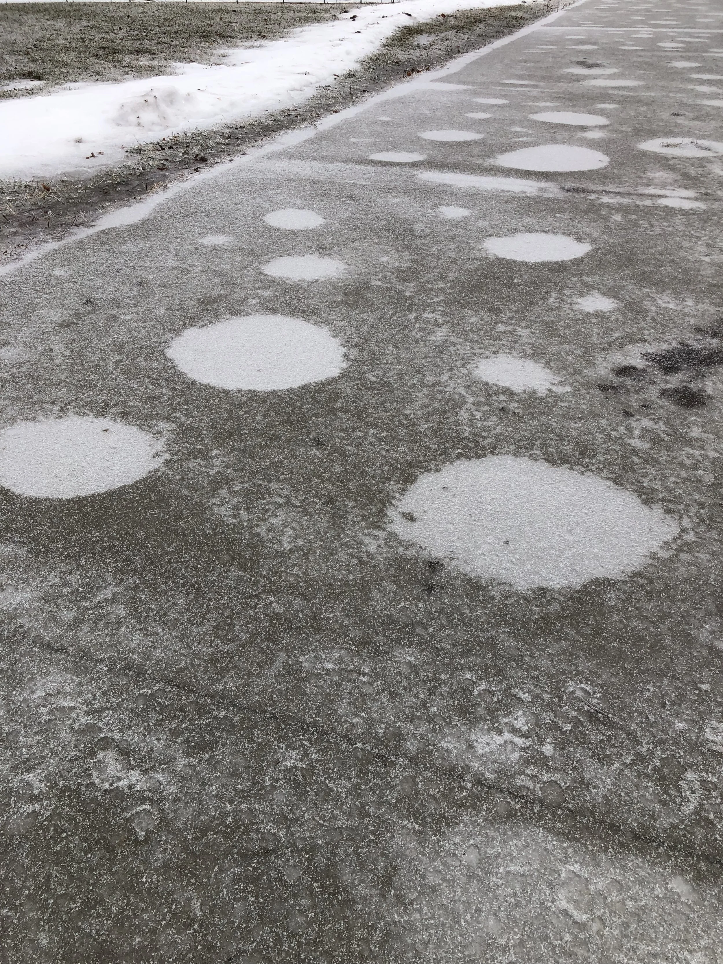 At least half an inch of ice on everything that hasn’t been scraped, chipped, salted, and shoveled. We were planning on attending a science fair, but that got iced out along with almost everything else.