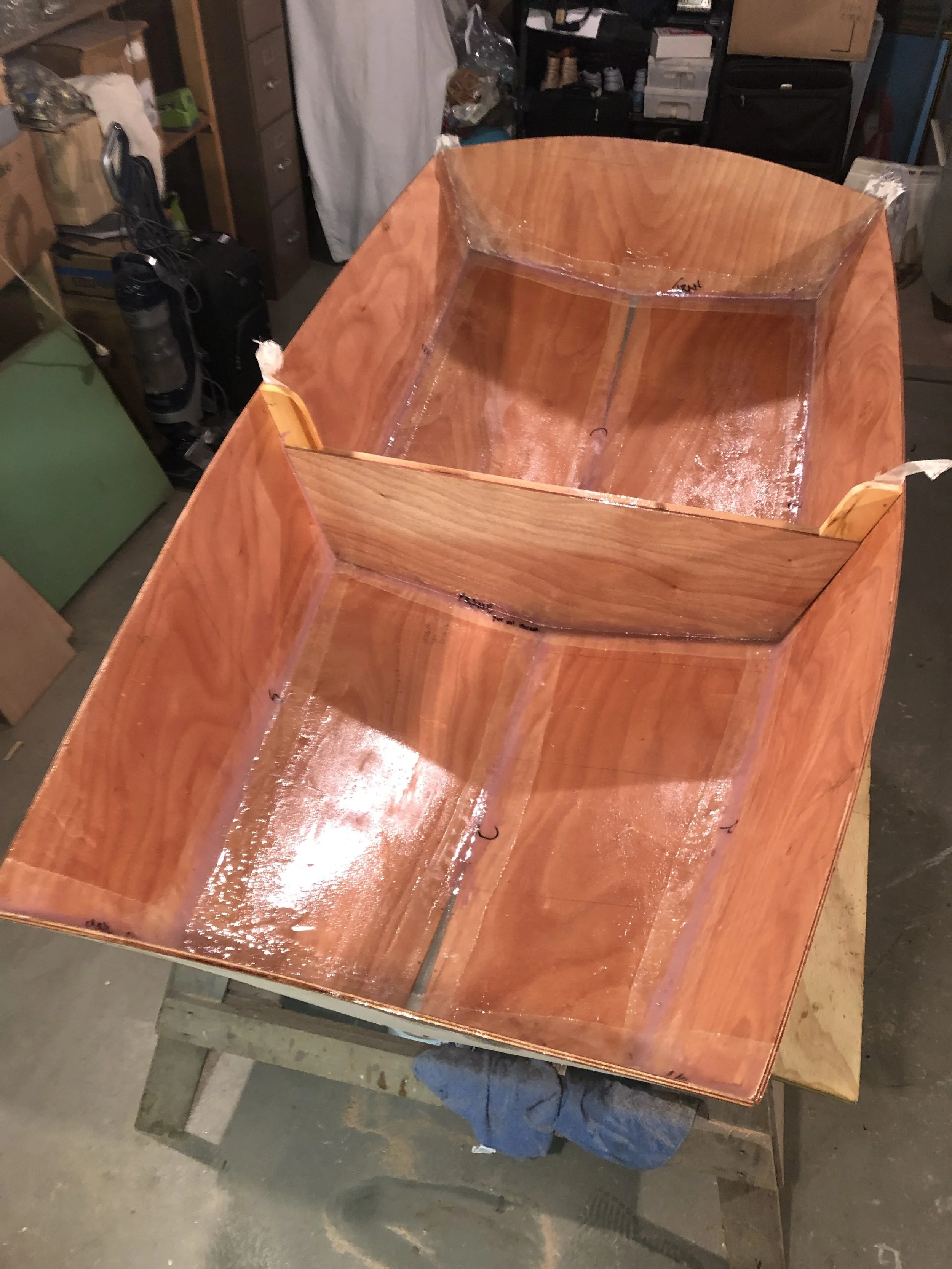 Glass and epoxy done on the interior. Next comes sanding and perhaps a little fairing. Then, over she goes, and the exterior gets the treatment.