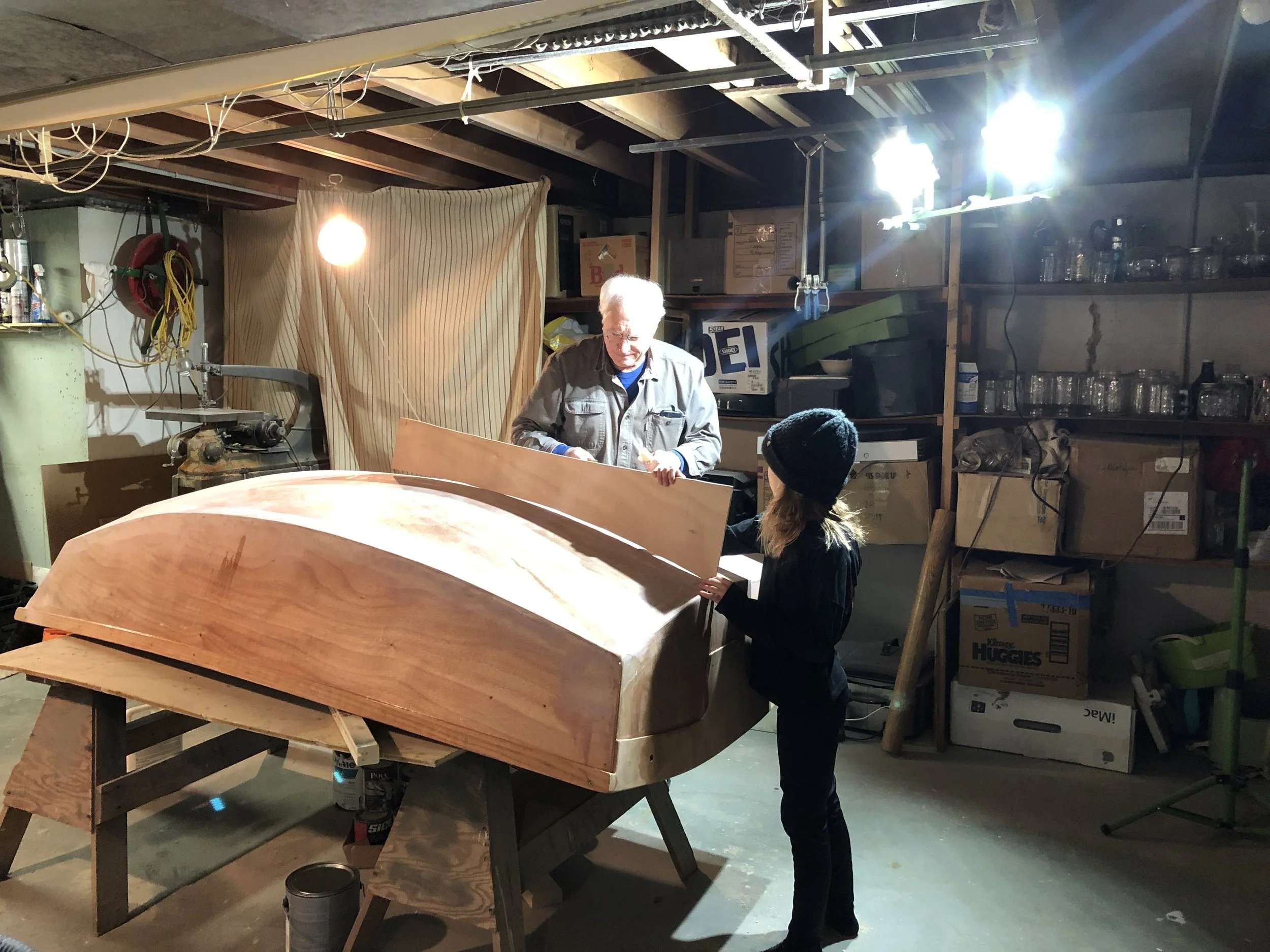 Below, Katy helping to shape a template for the skeg. She is good with tools, and a whiz at clamps.