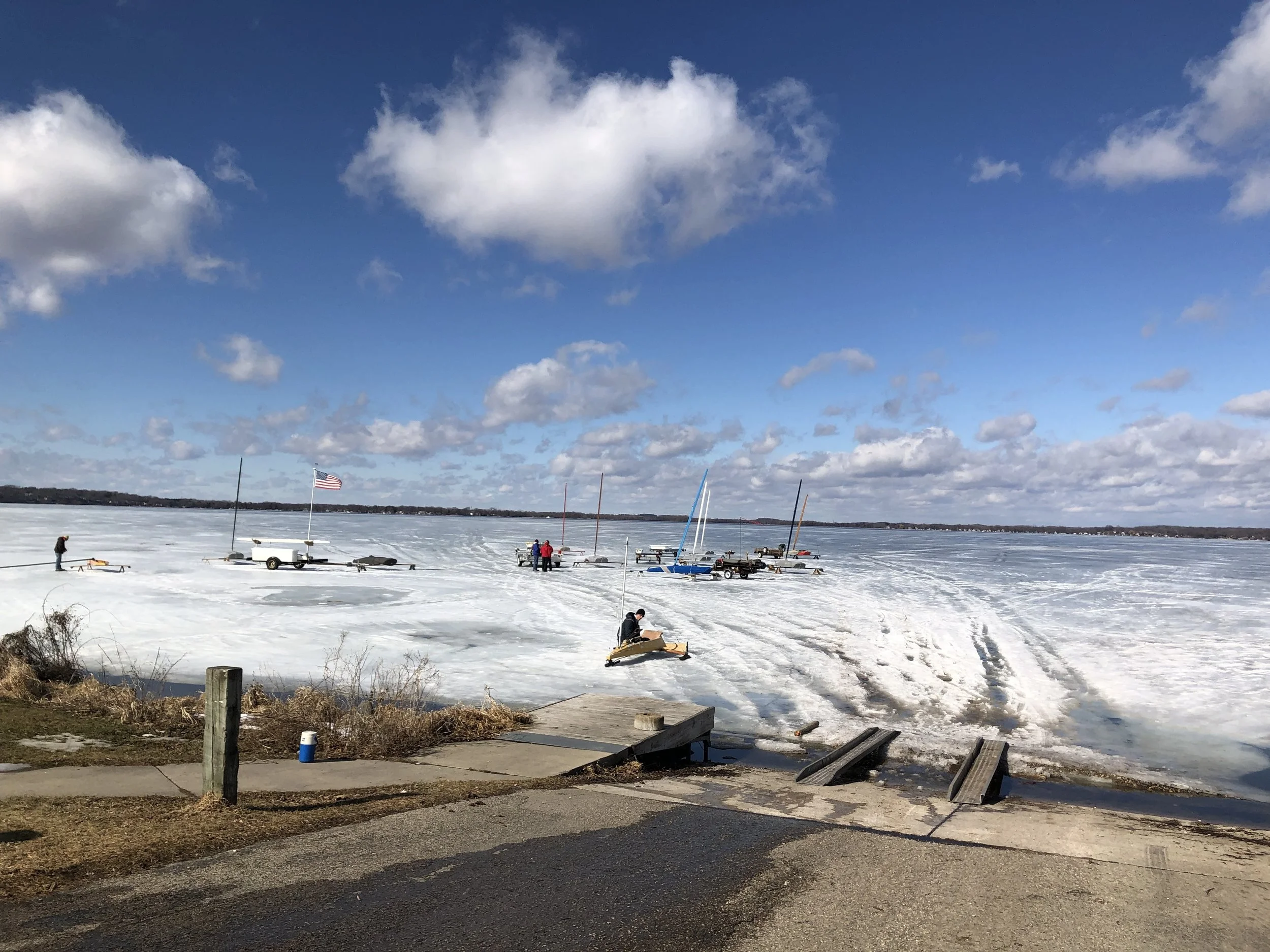The Nite Nationals have been called on, on Lake Kegonsa, just south of Madison. Early start tomorrow, so many boats arriving and setting up this afternoon. But conditions are bad. Ice pure slush, at least near shore, and the on-ramp very tenuous—and, of course, the on-ramp is also the off ramp.