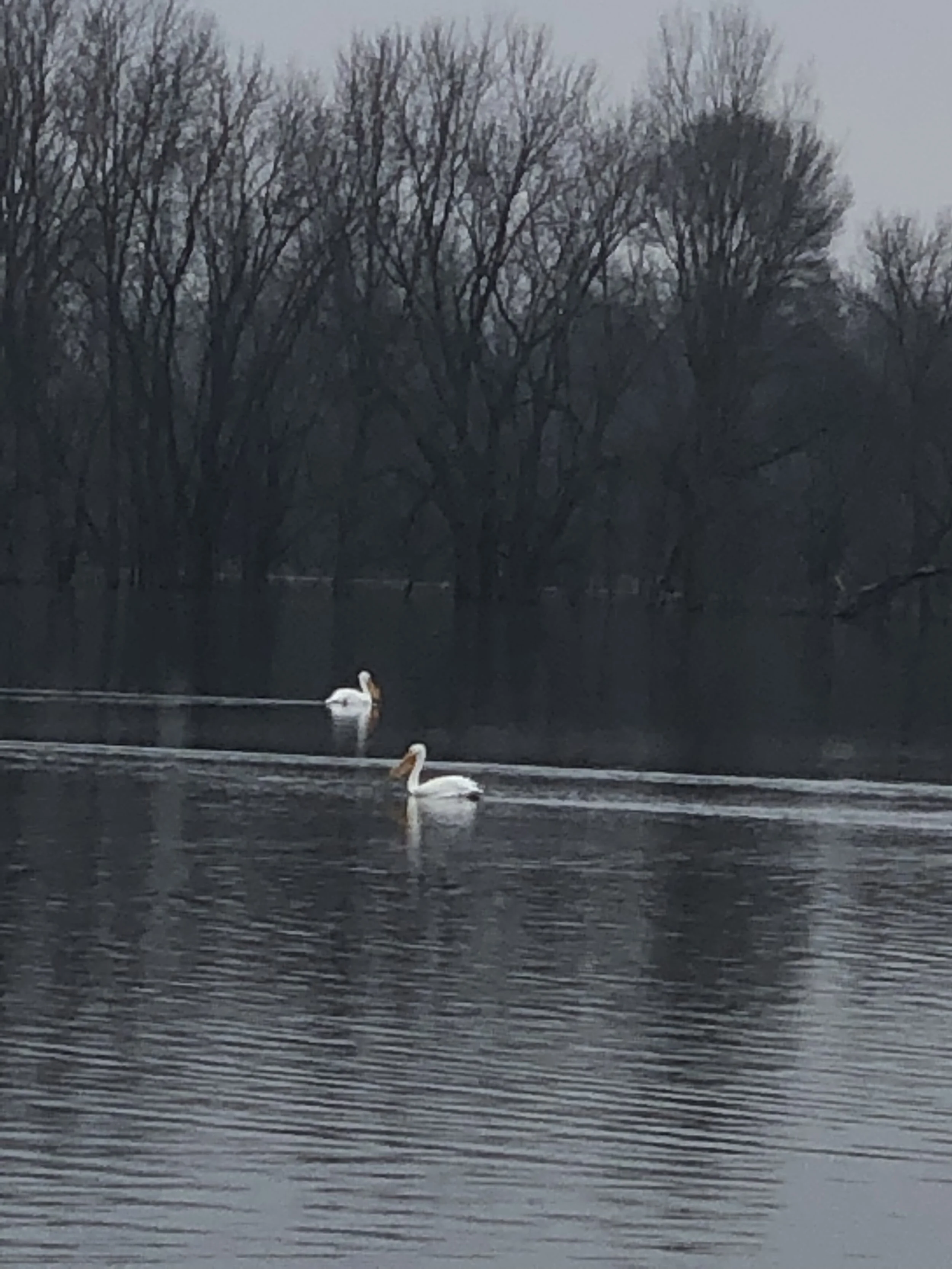 White pelicans, which have, in the past decade, begun reappearing in Wisconsin. This flock of maybe a dozen birds is probably on its way to Horicon Marsh or Green Bay. Not sure what they are eating here as the water is only half a foot deep.