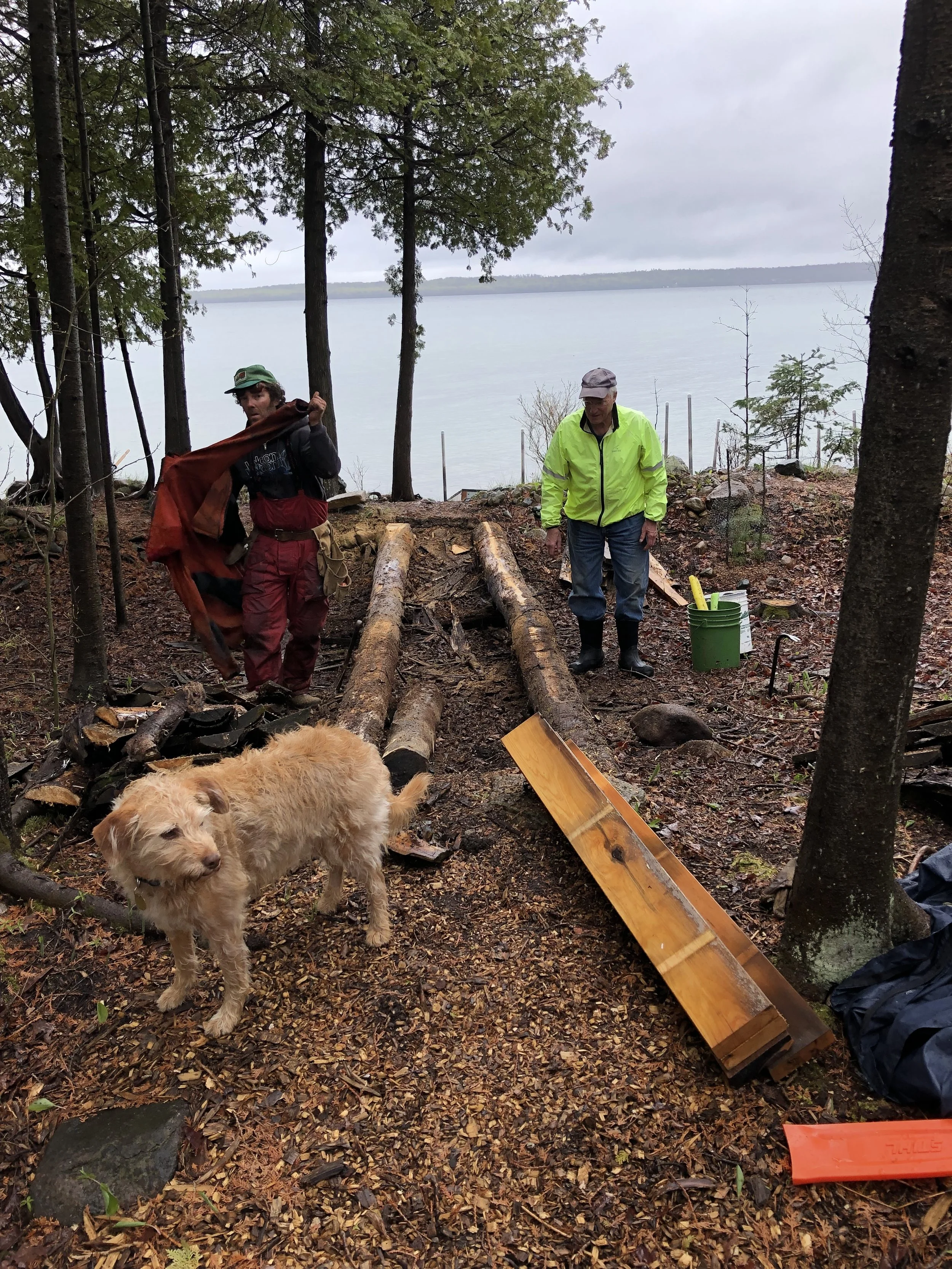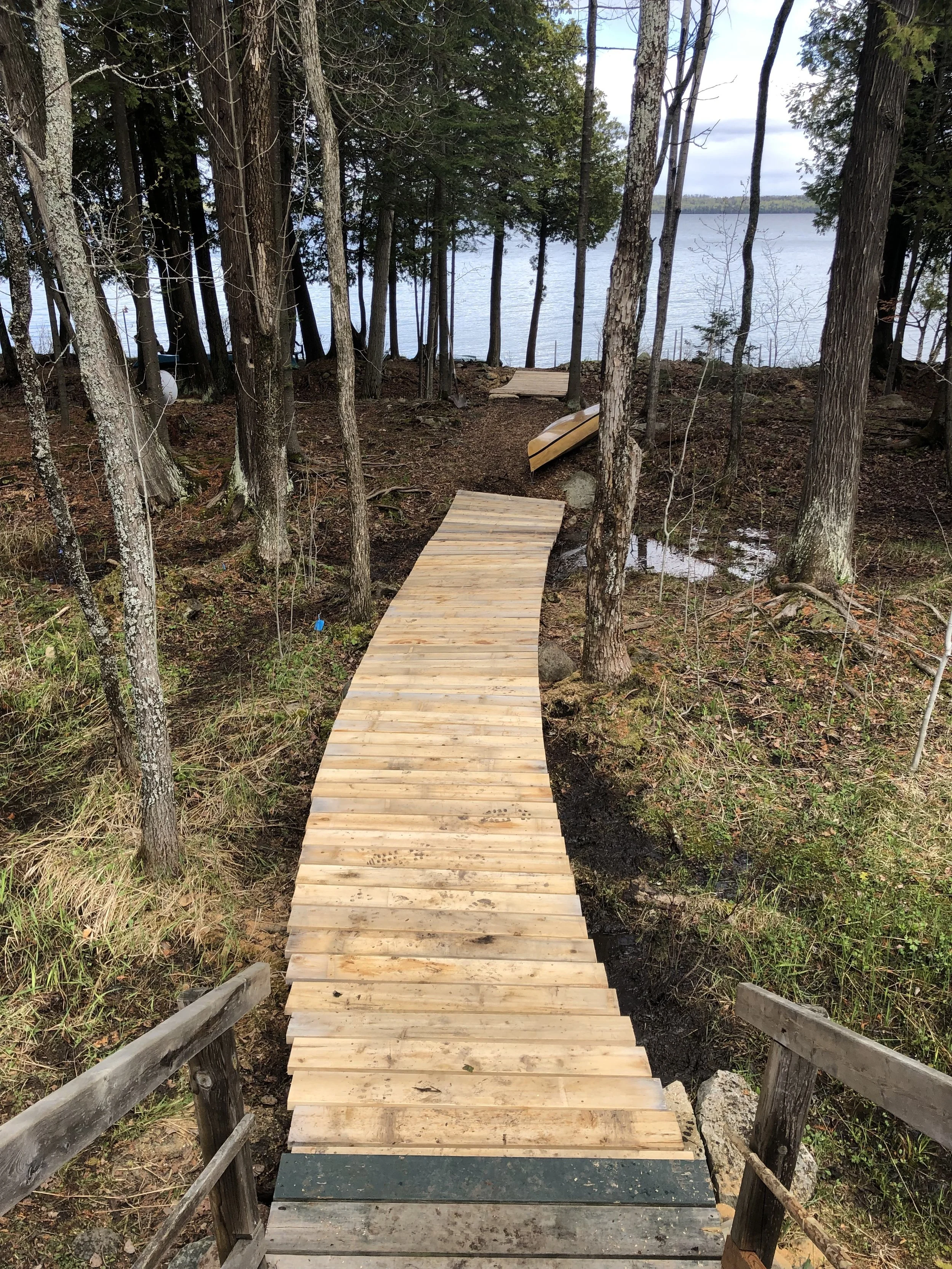 All the old slabs and other miscellaneous pieces of scrap lumber ripped off the underlying cedar logs, and then replaced with 2x6 cedar boards. One hundred of them. Under the old boardwalk we found, not the Drifters, but half a dozen beautiful little black and red salamanders. Not so much need now to “Watch Your Step!”