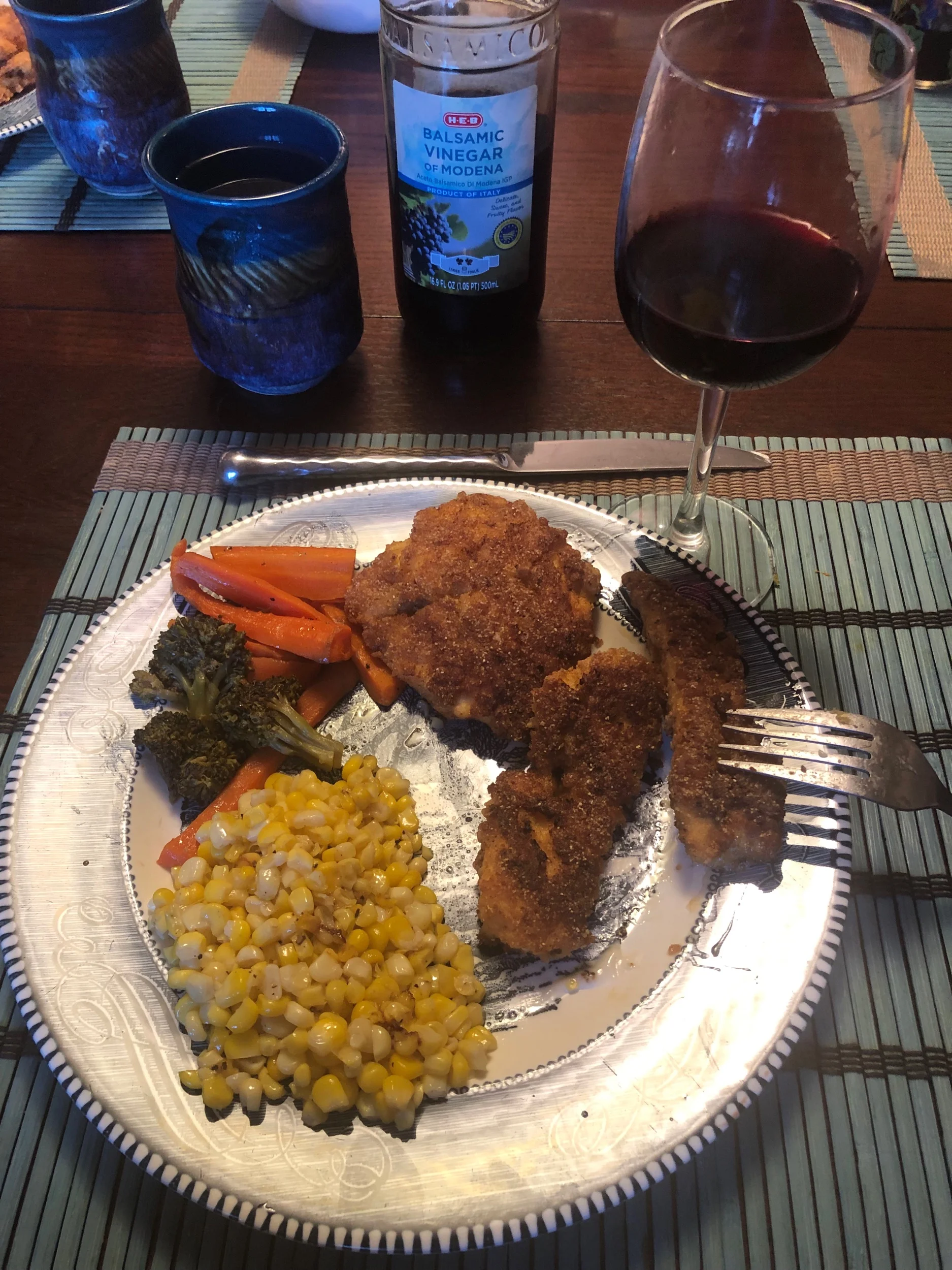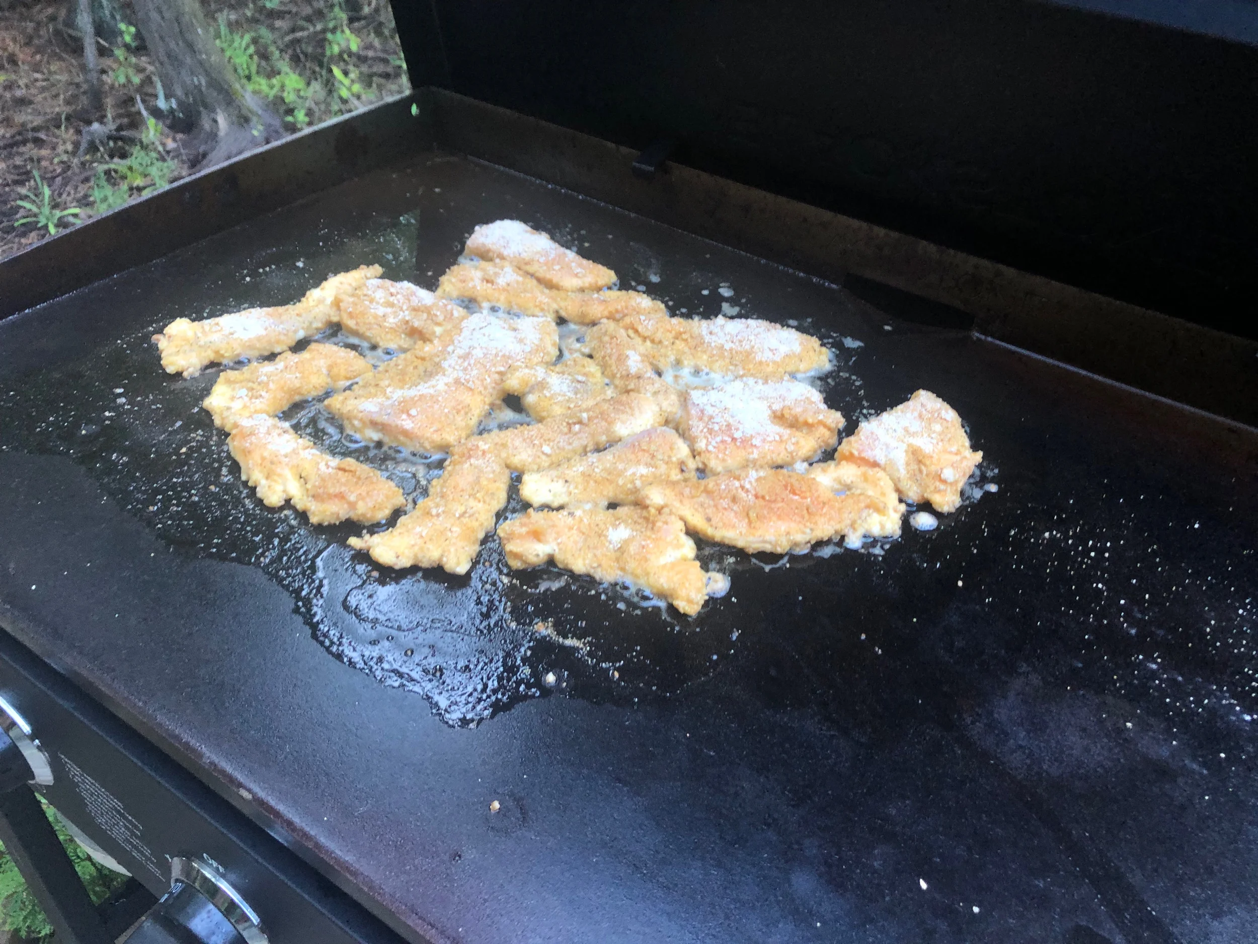 Bri’s lake trout on the menu tonight—prepared and cooked here but taken to Pinebox for the actual serving. Irrigated in a mix of egg, milk, and butter, then dredged in a mix of flour, cornmeal, and saltine crumbs. Fried on the outdoor griddle in just a little oil.