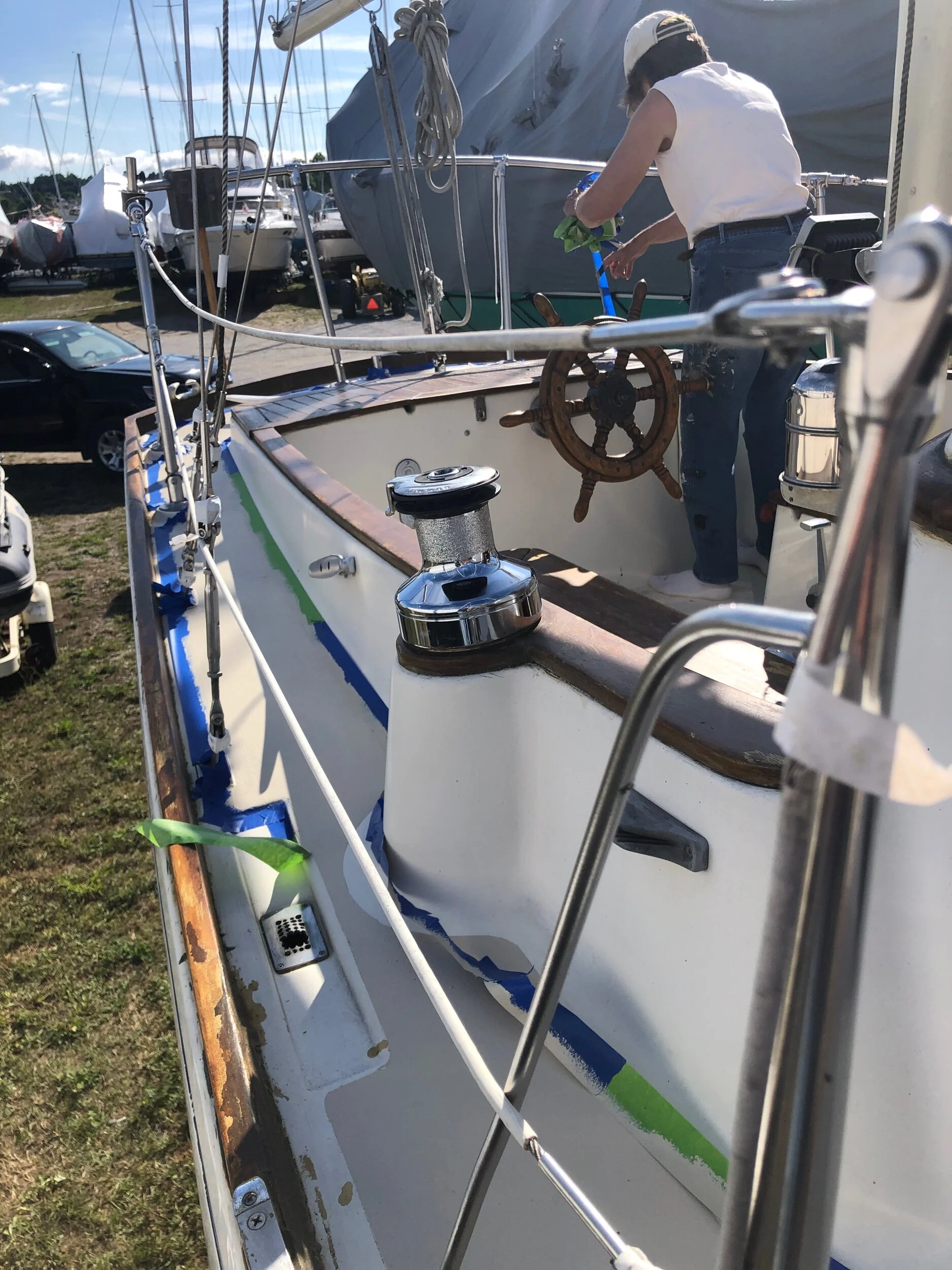 Beautiful day, but hot in the sun kneeling and crawling along the deck with a roll of masking tape and then a paint roller. A few sweat drops mixed in with deck paint.