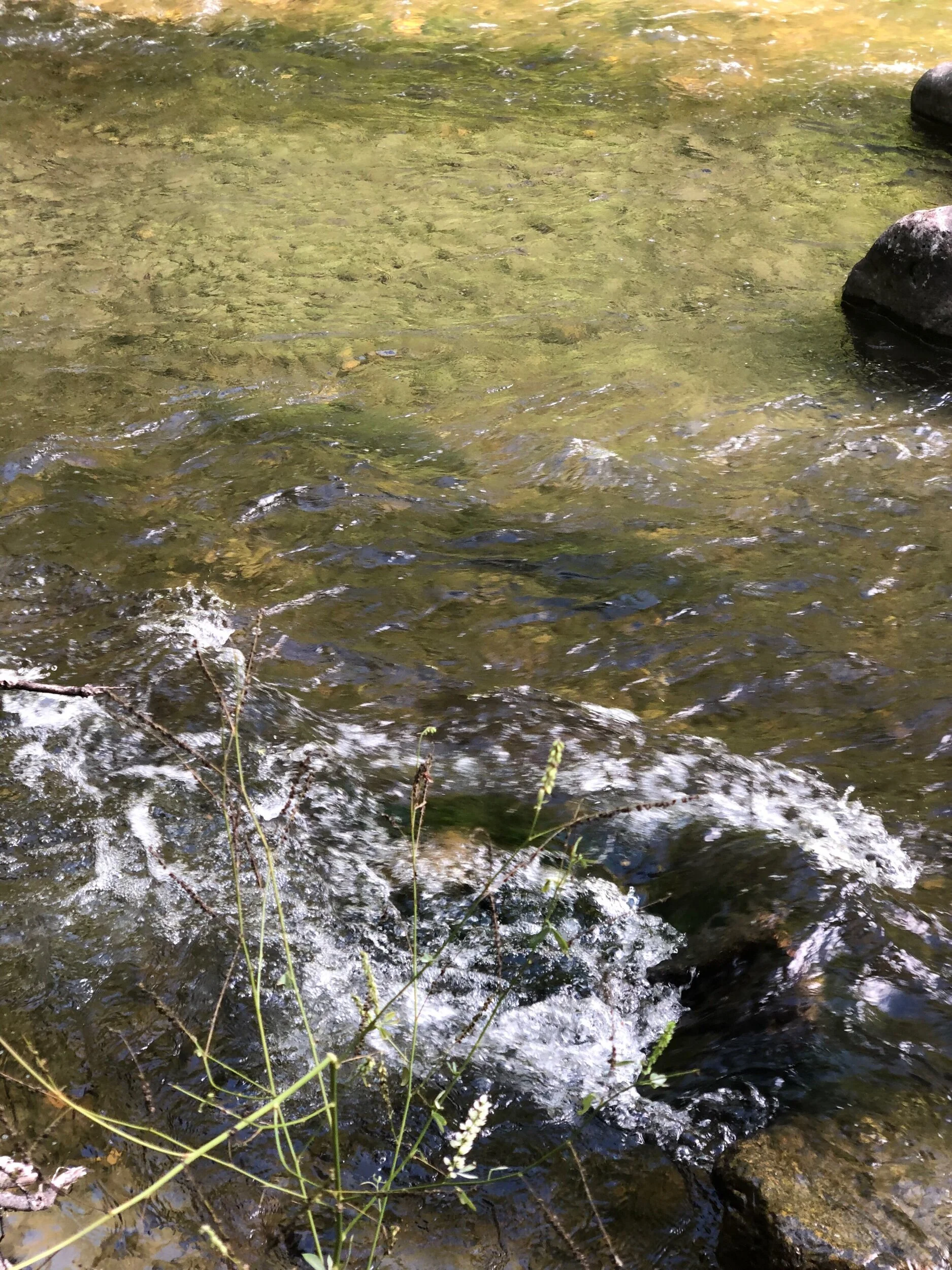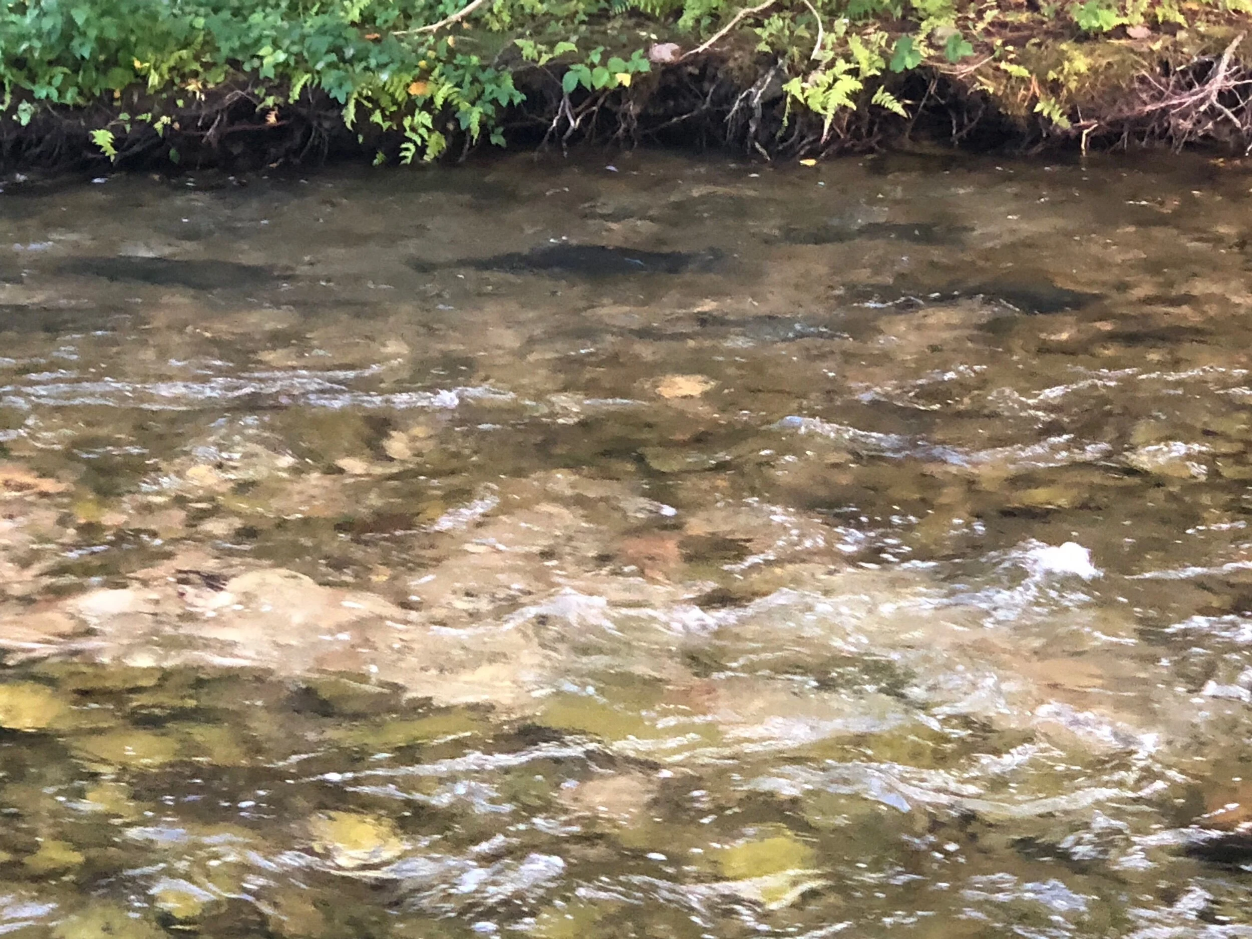 Many big fish working their way up river, resting in the slack water before thrashing up the rapids.