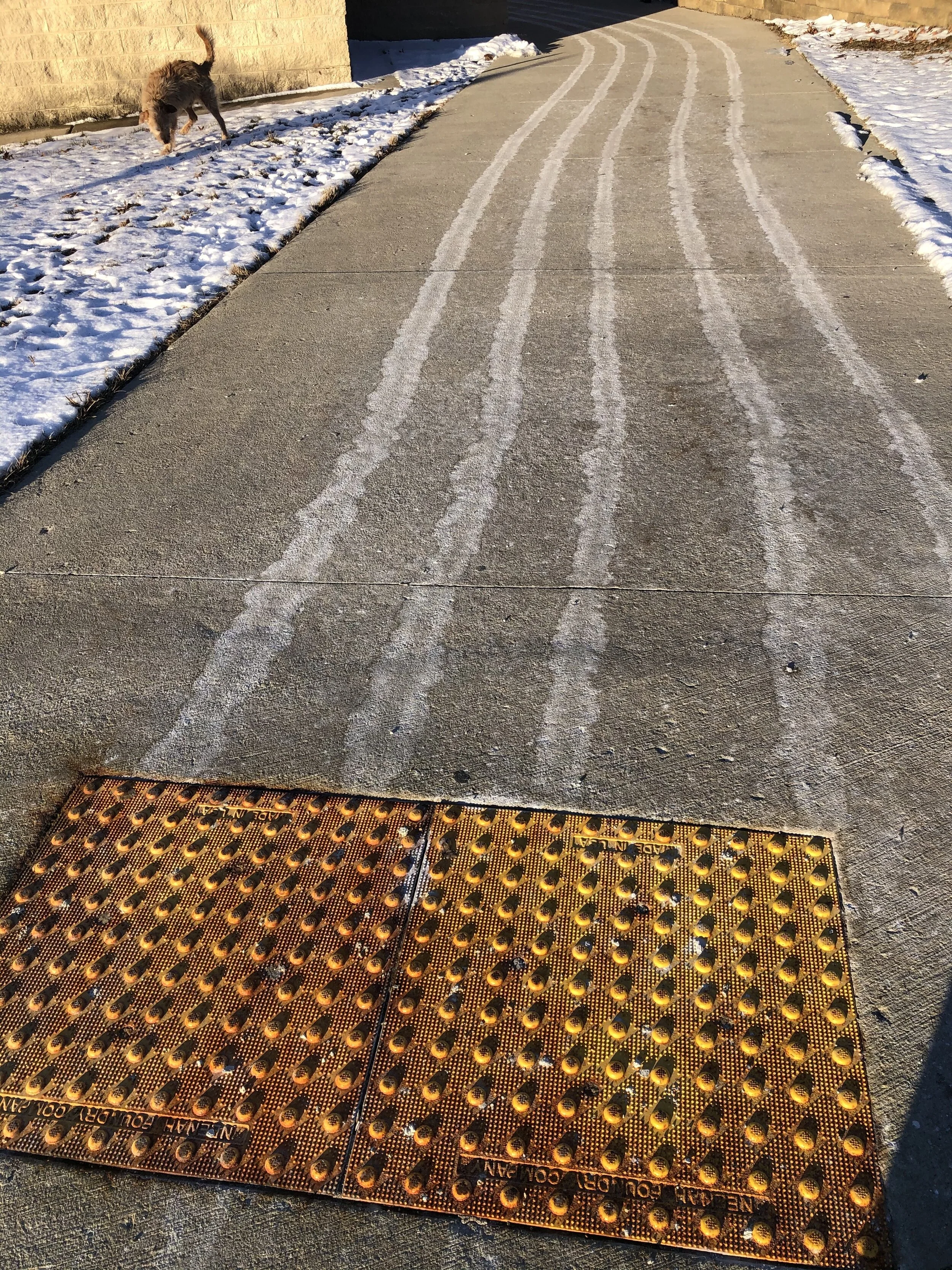 But I did not come here to talk about flies. In the photo above, the stripes are lines of dried saline solution, which is applied to sidewalks all around campus in advance of adverse weather. Nowadays saline stripes are a fairly reliable predictor of coming attractions, up there with the barometer. Sharp cold last night, today, and tonight. Ice is being made, but, of course, the snow will soon be coming.