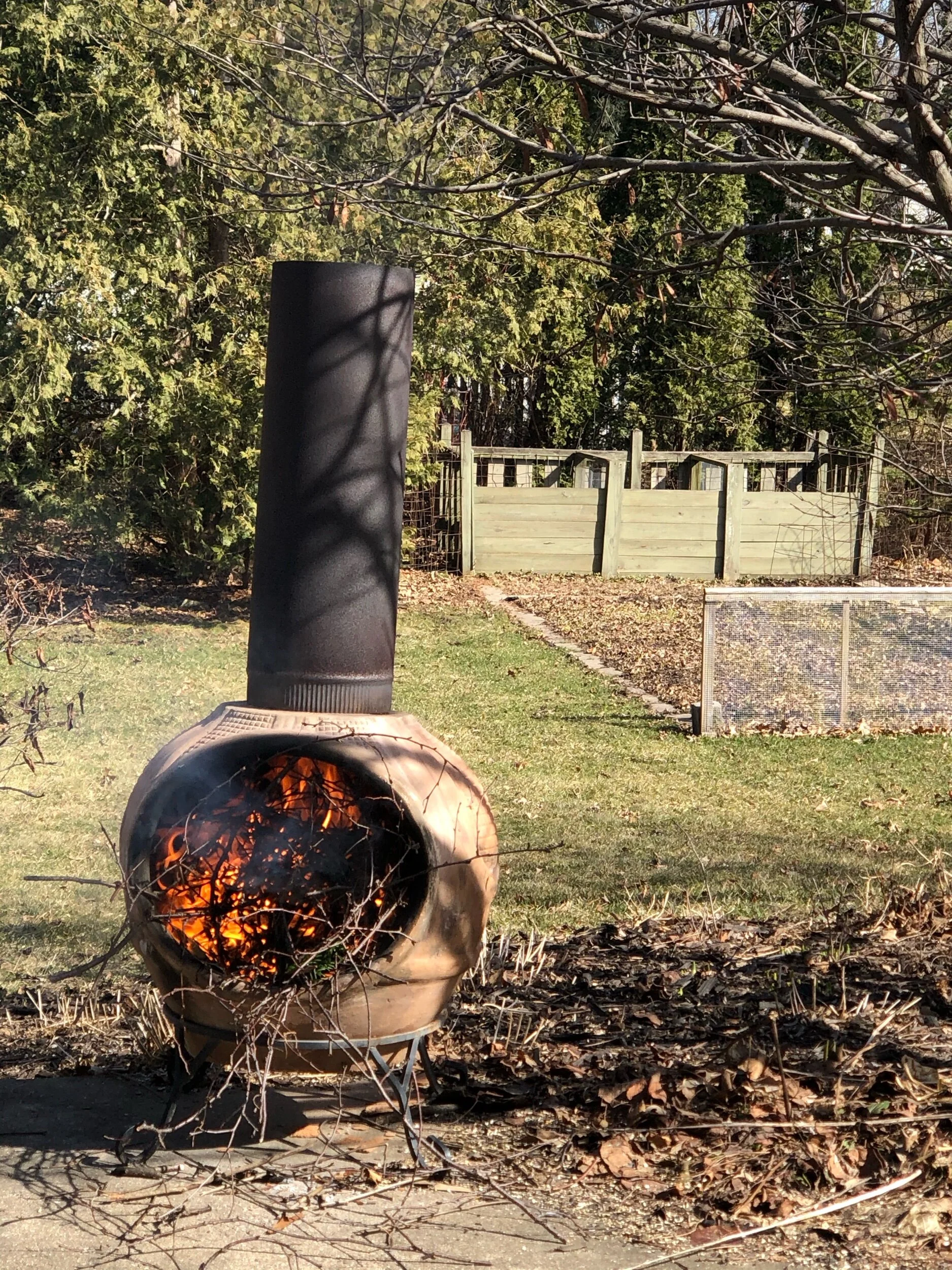 Back yard loudly musical, while Pax and I converted a pile of front yard birch windfalls to ash.
