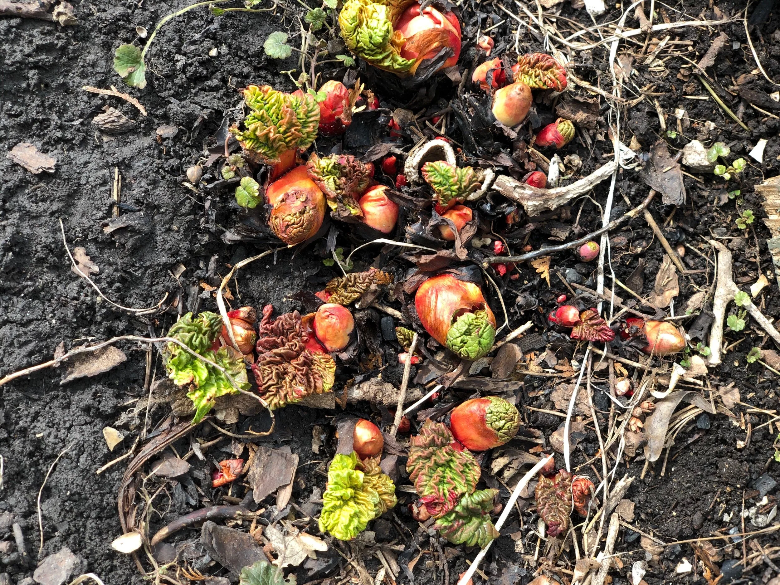 Rhubarb, getting started. The first real vegetable of the year, and full of vitamin C.