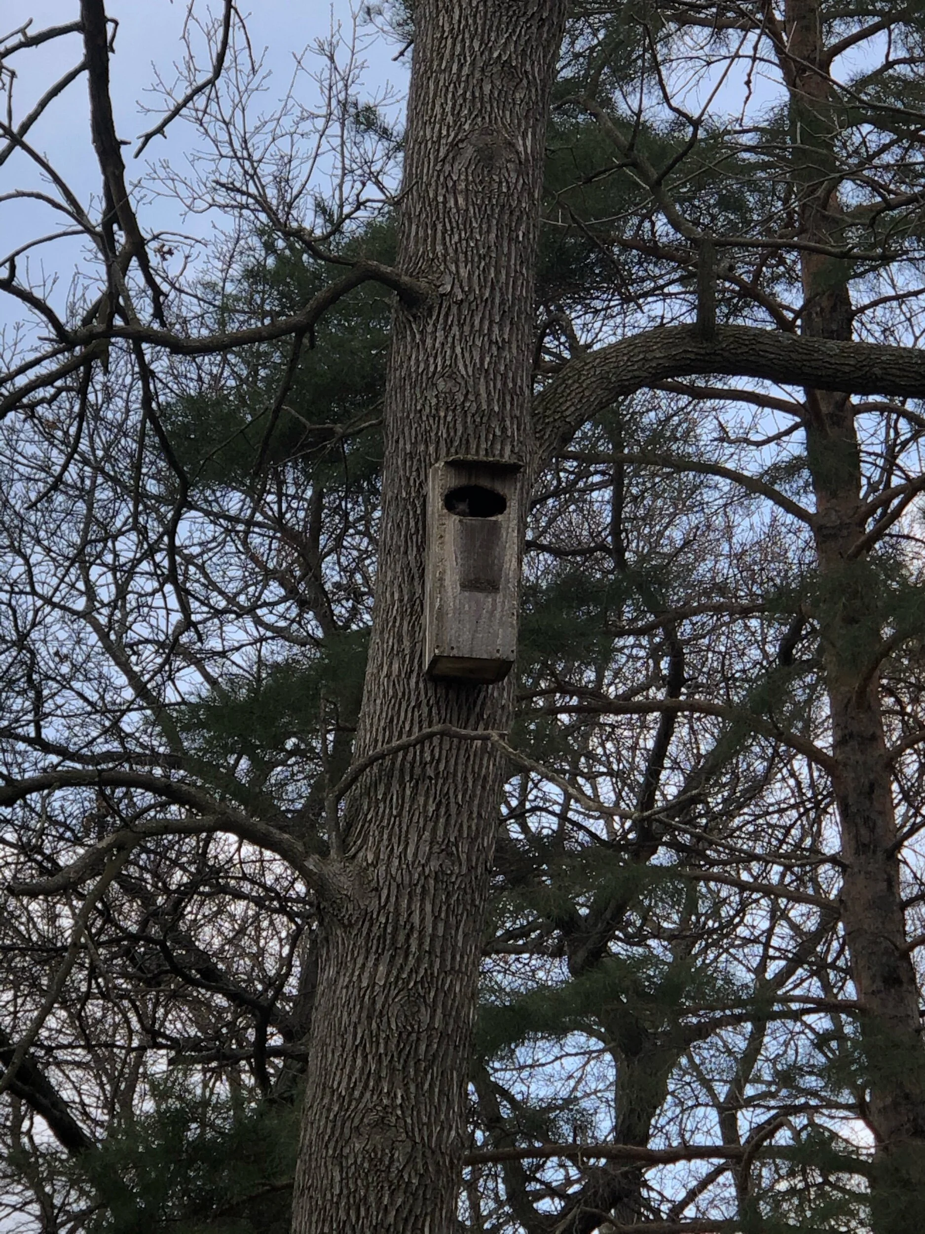 Wood duck nest box. But a close look may indicate that a wood duck is not the current occupant.