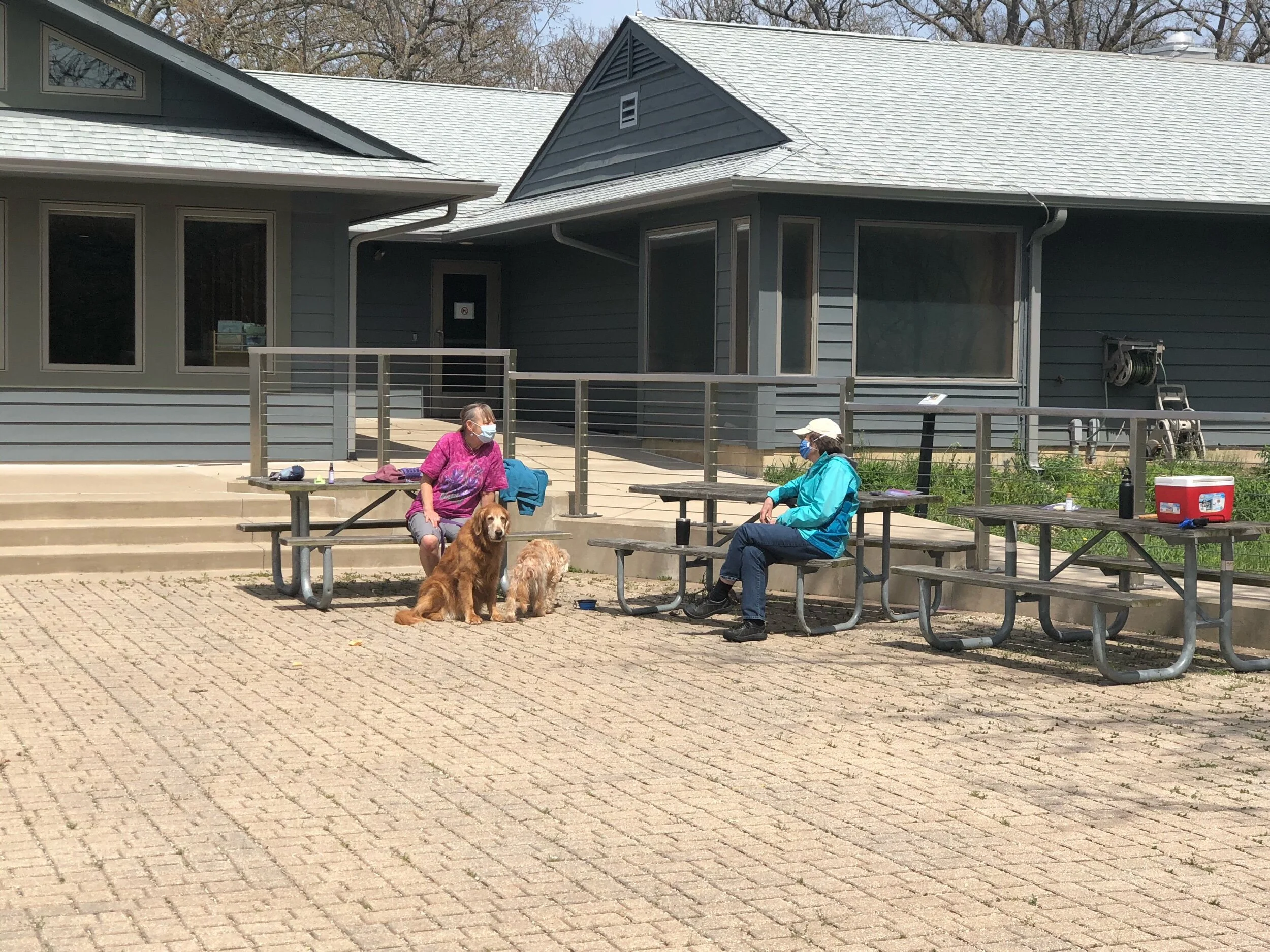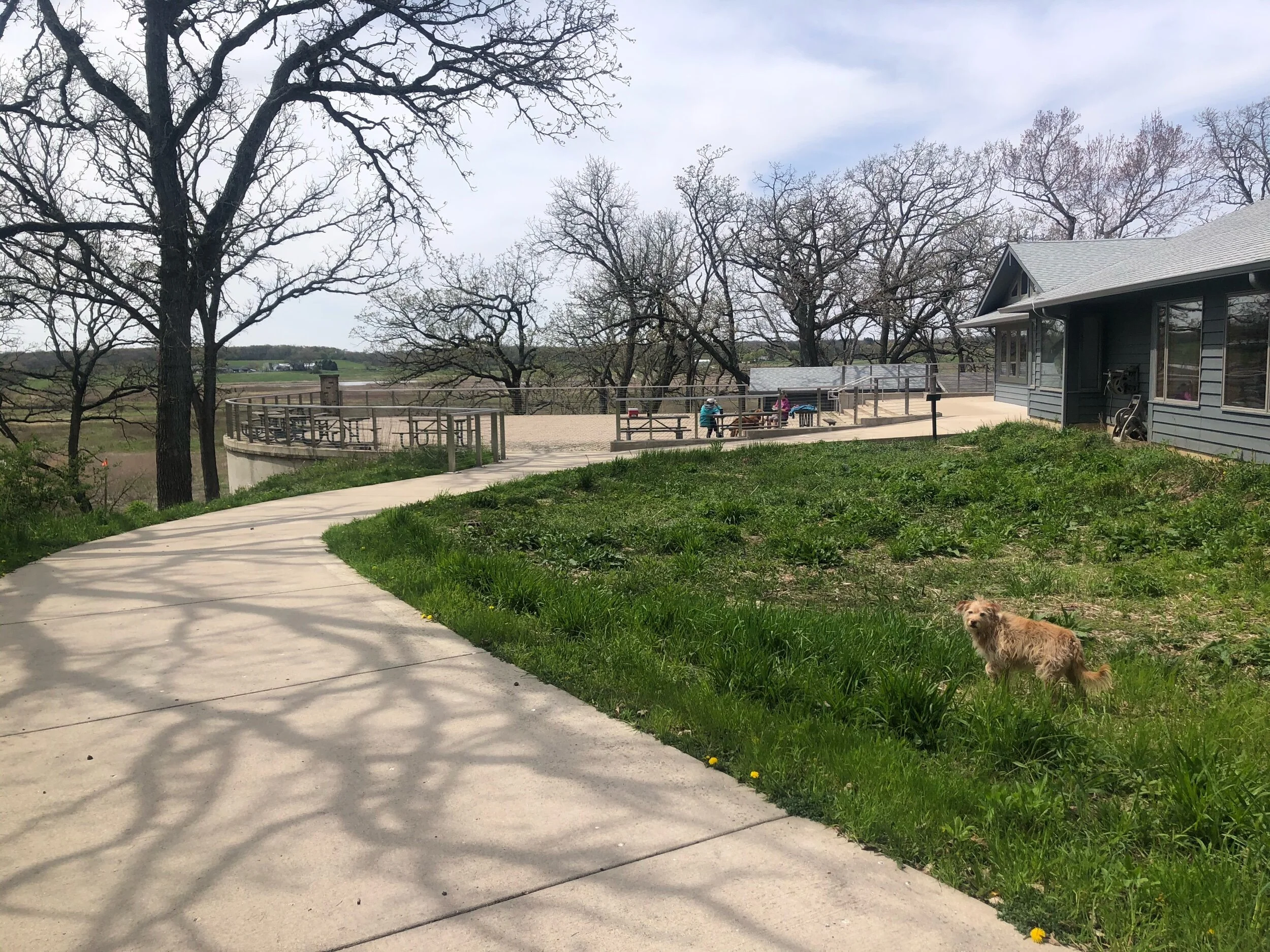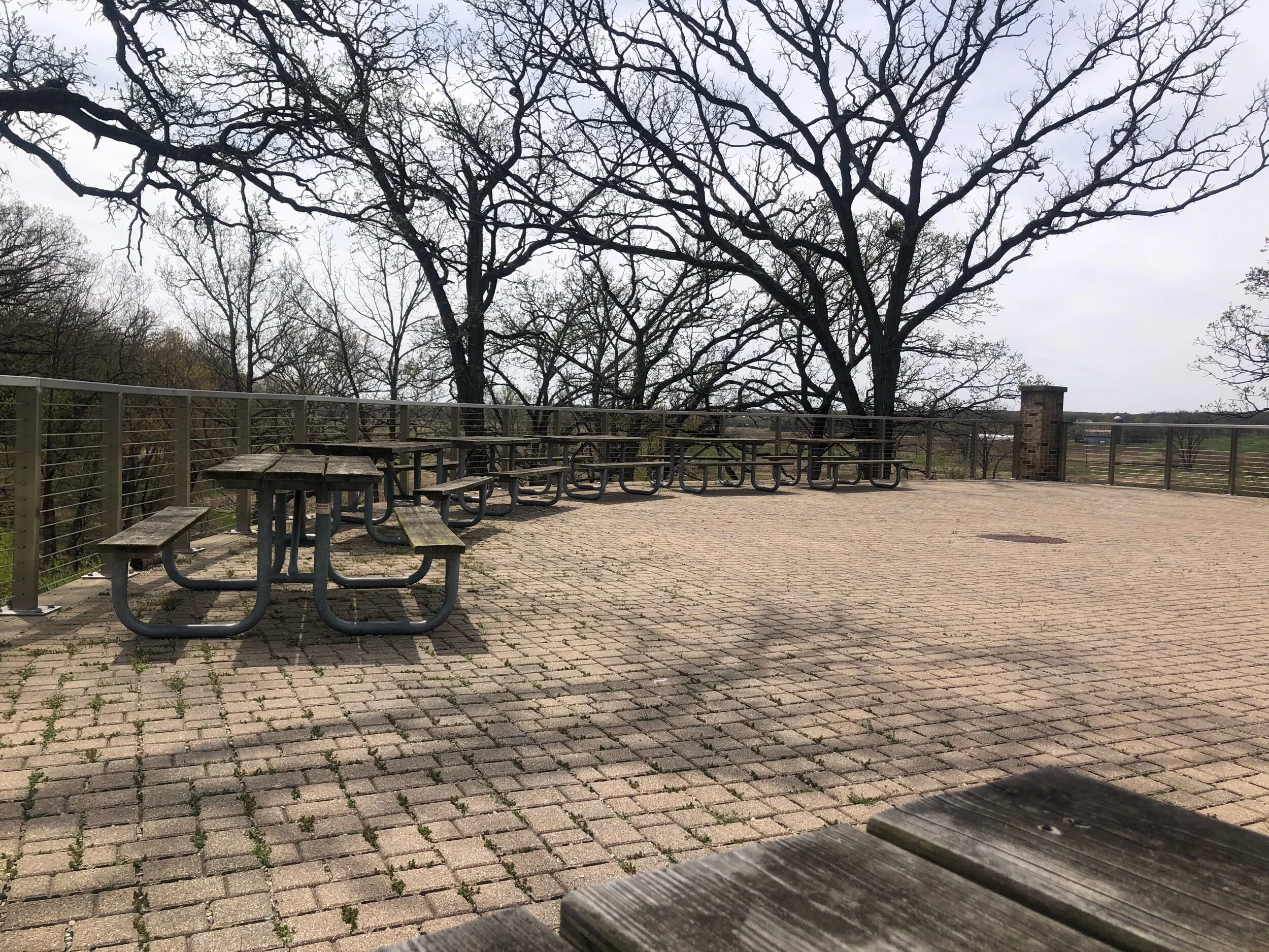 Three thousand five hundred acres shaped by the southern end of the Wisconsin glaciation. Park open, but facilities closed, and, as a result, we had the whole sky patio behind the visitor center all to ourselves. Because the visitor center was closed, the only access to the patio was by means a a small sidewalk around the back of the building. Although quite a few other folks (and dogs) were enjoying the fine weather, no one else, apparently, thought about checking out the backside.