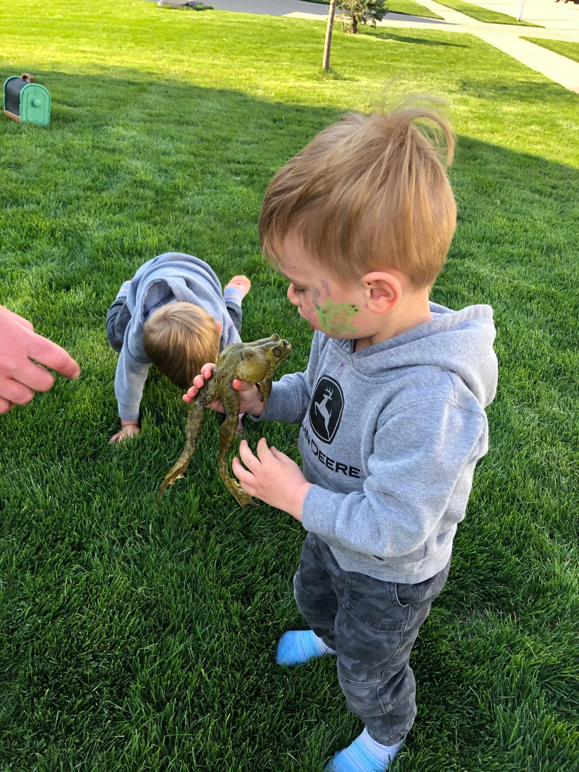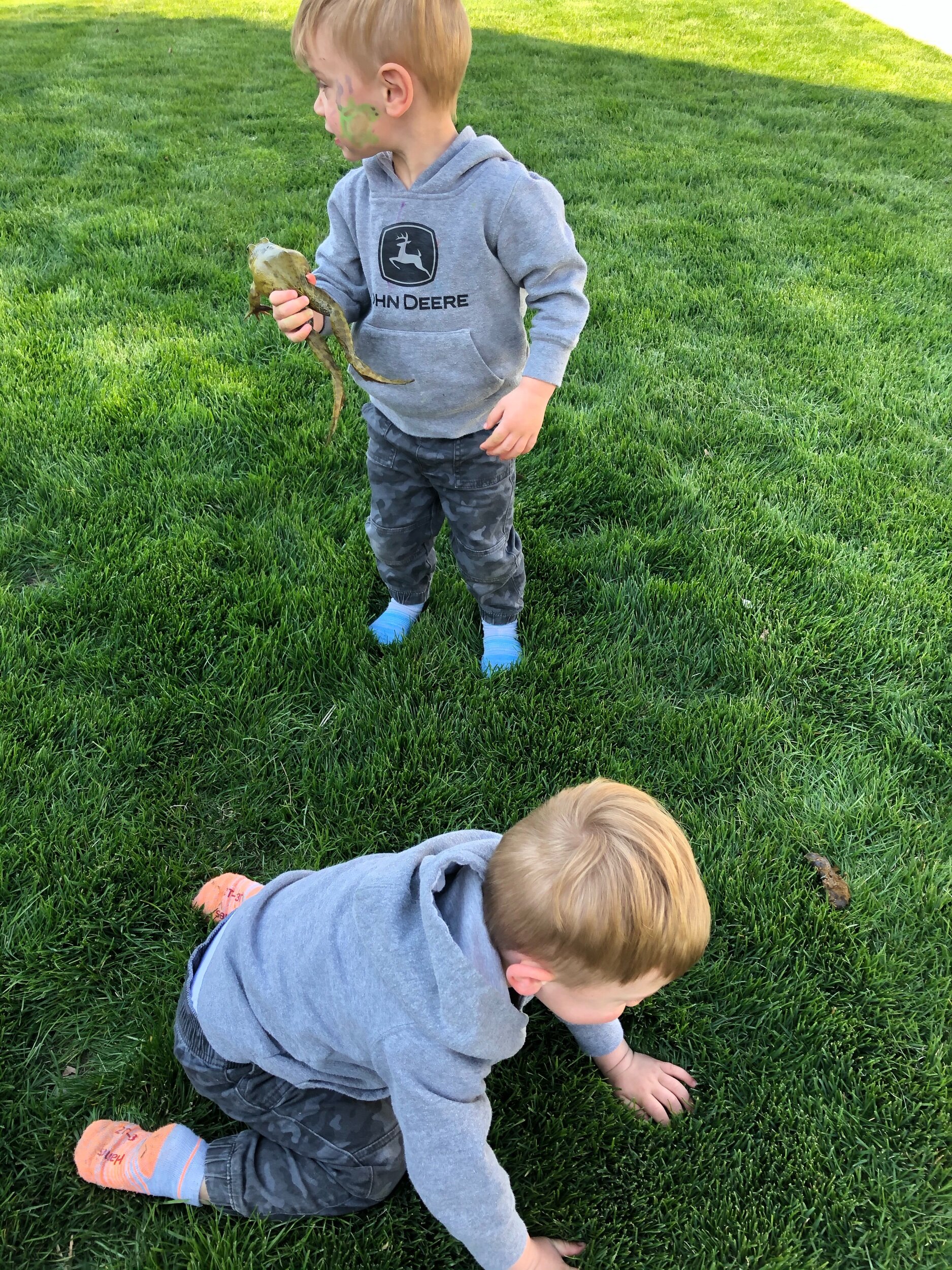 The boys like holding frogs, sometimes kissing frogs, and being frogs.