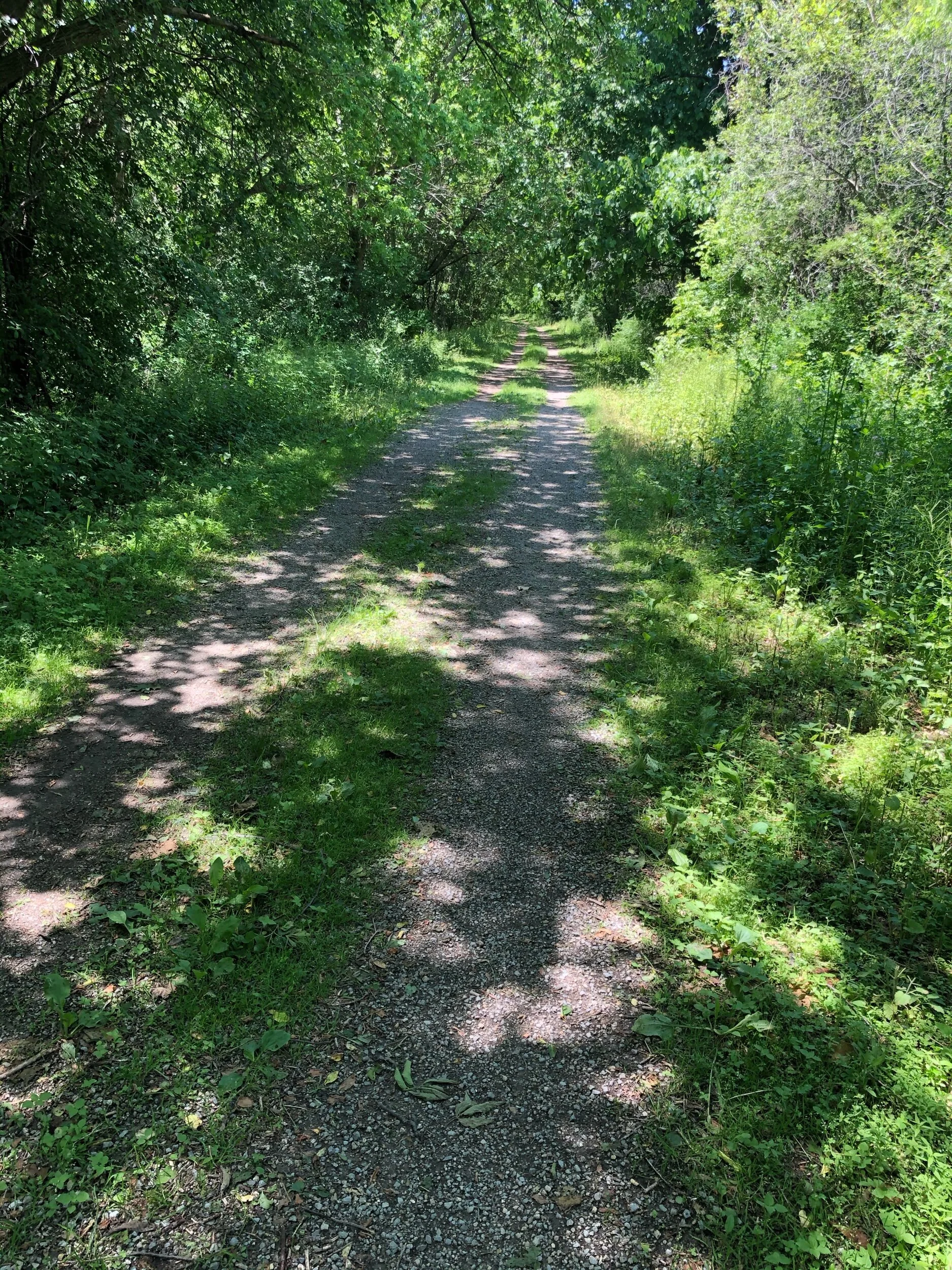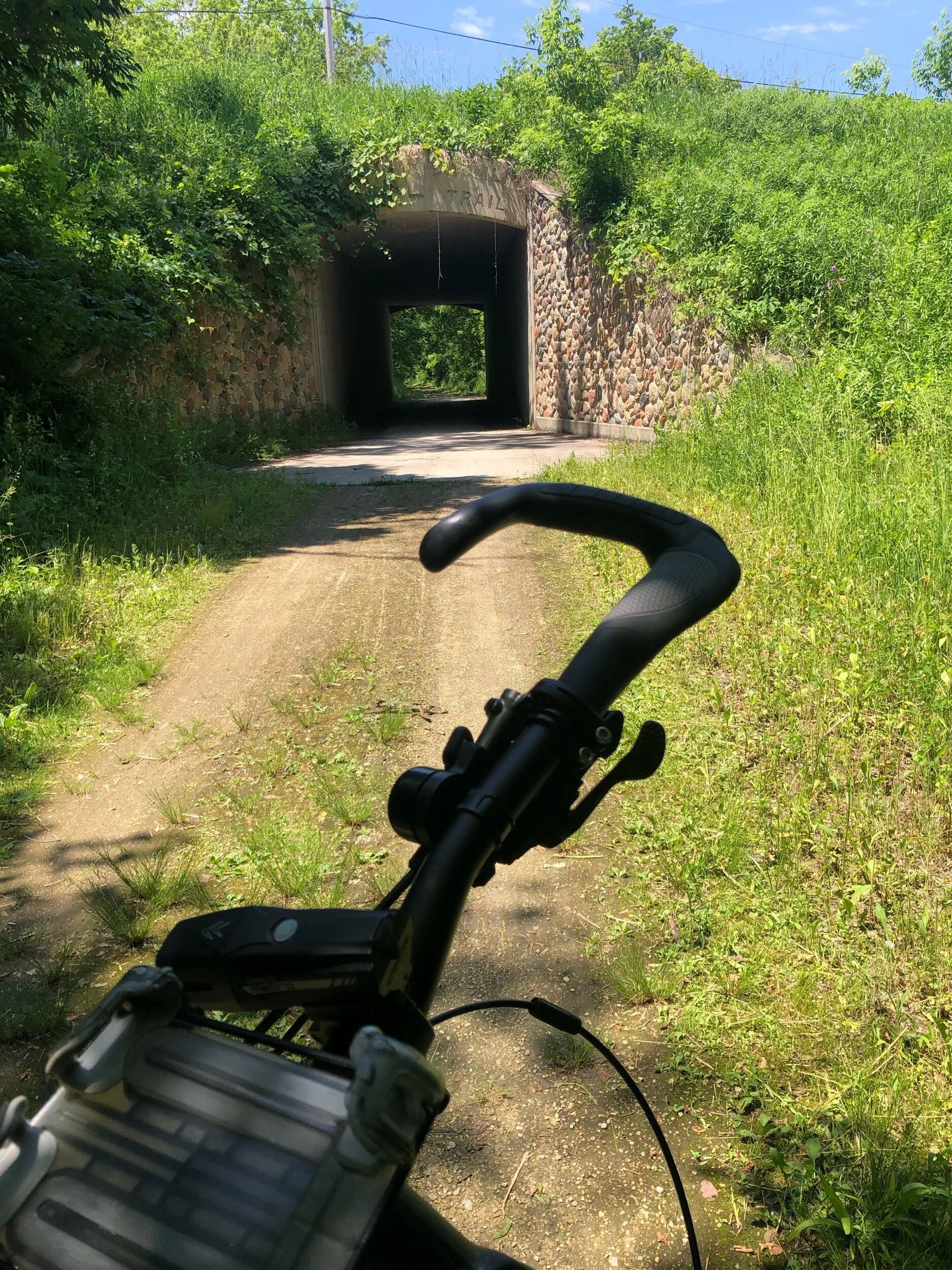 Mostly a tunnel of trees, an arching canopy, sometimes low enough to give a thwack on the helmet or require a quick duck of the head. Old RR right of way, sometimes elevated, sometimes sunken like the Natchez trace. All gravel or compacted dirt. A feeling of wild, although never very far from a highway. Just over 10 miles, with an average speed of 14 mph, and a fun factor of 9.8. A covid adventure par excellence.