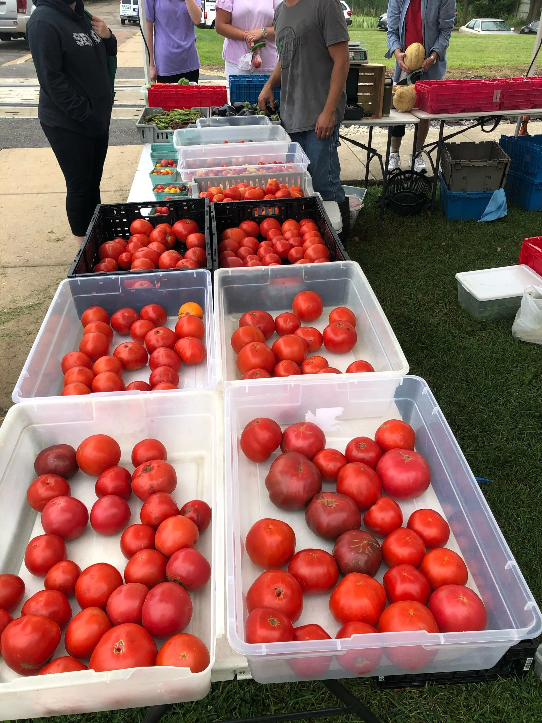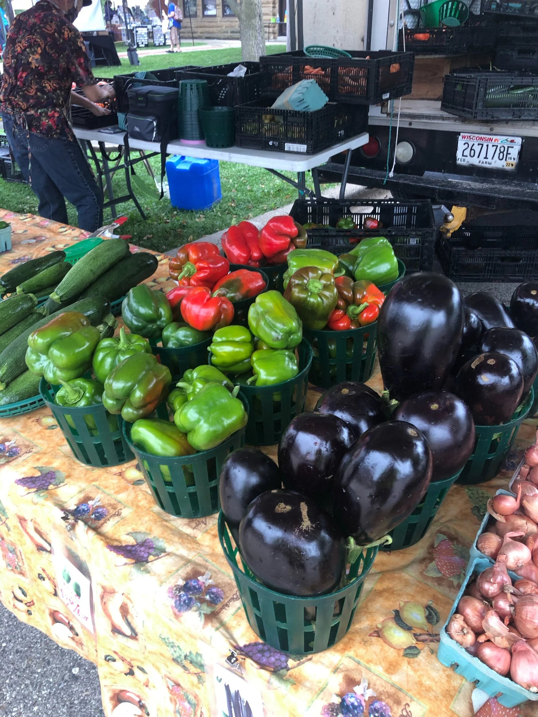 Musk melon, sweet corn, aubergines, ugly tomatoes (discounted due to appearance, but great for eating and even better for soup). Also eggs and roasting chicken.