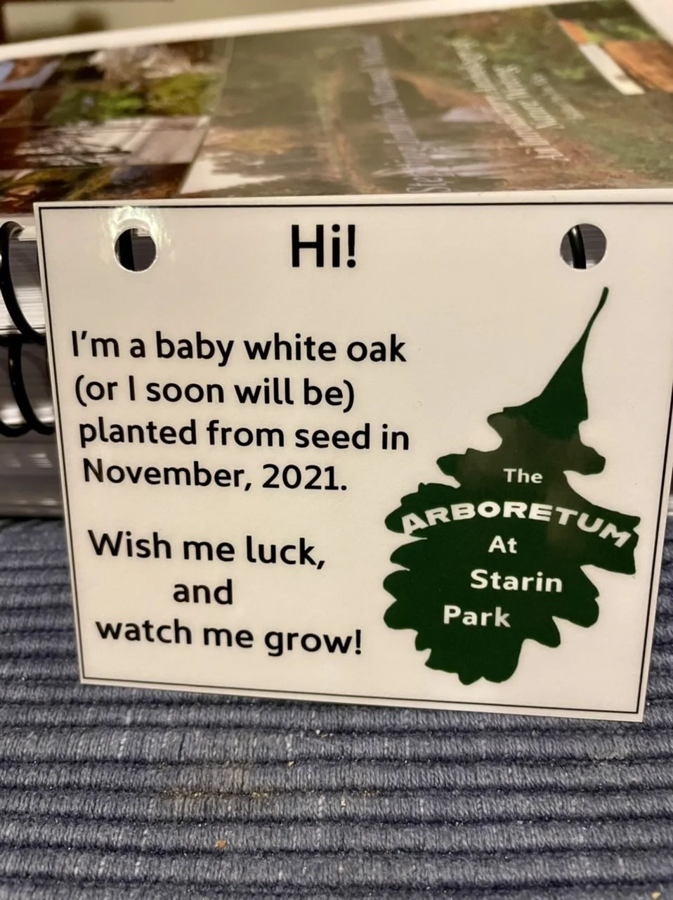 Six sprouted white oak acorns planted in home-made squirrel-proof cages by a few of us Urban Forestry Commission folks and one high school student! We consider one student a good beginning, with the hope that a year from now we will have dozens.
