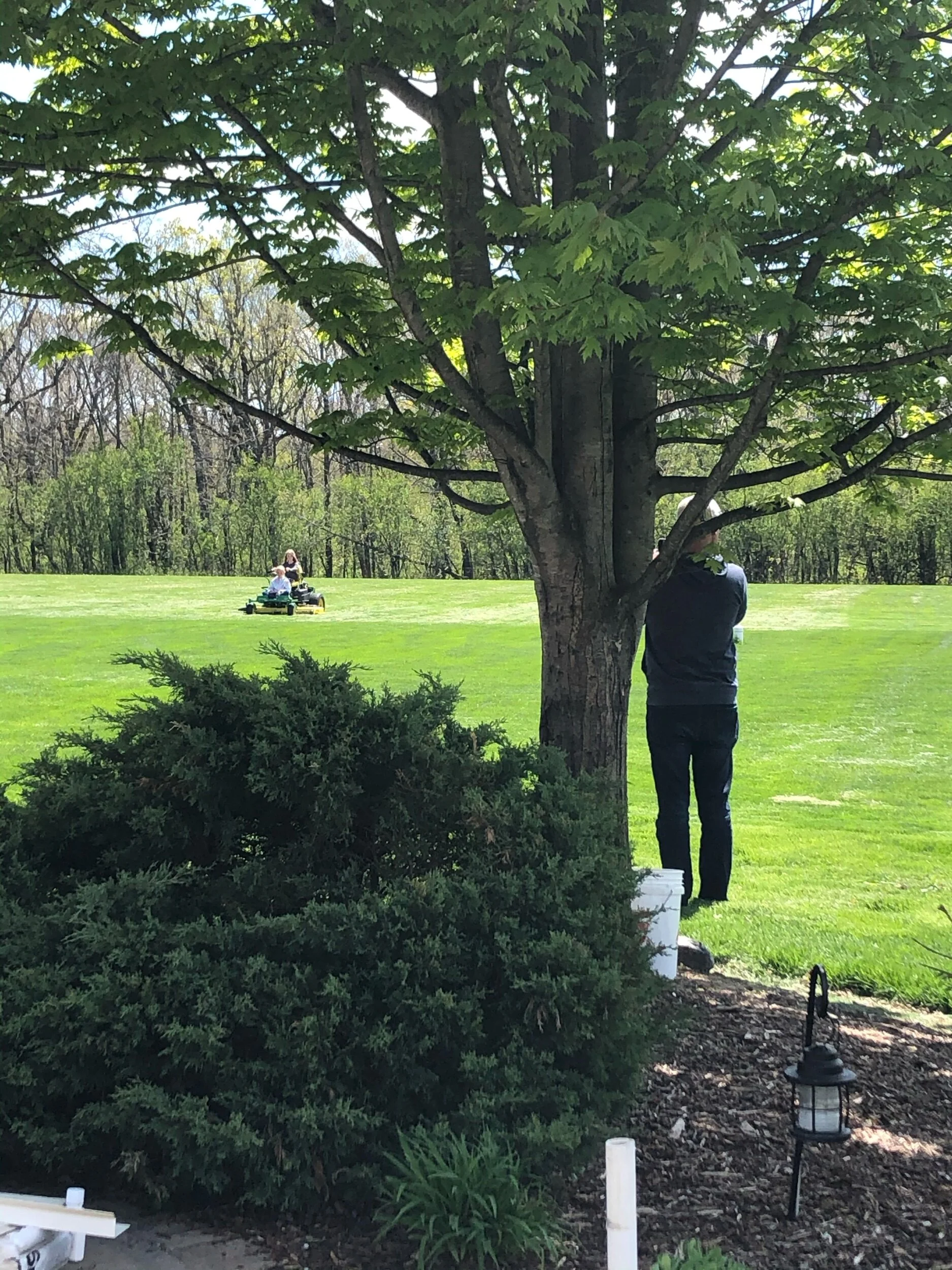 Trim bushes and take a few photos, at the new house, on what was not really a work day. Nonetheless, the bushes got chopped, and James caught a grub, also known as a “grump,” but during lunch, in a moment of inattention, Paxton ate it, much to the chagrin of the hunter.